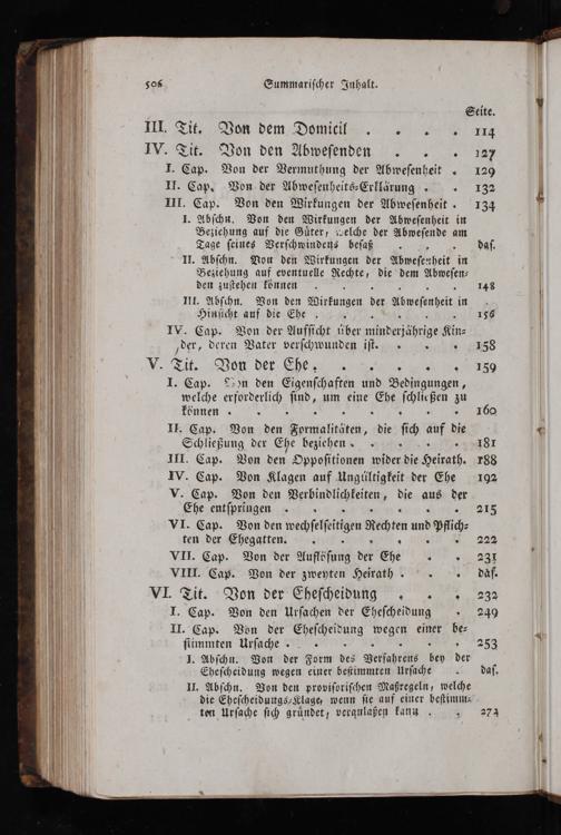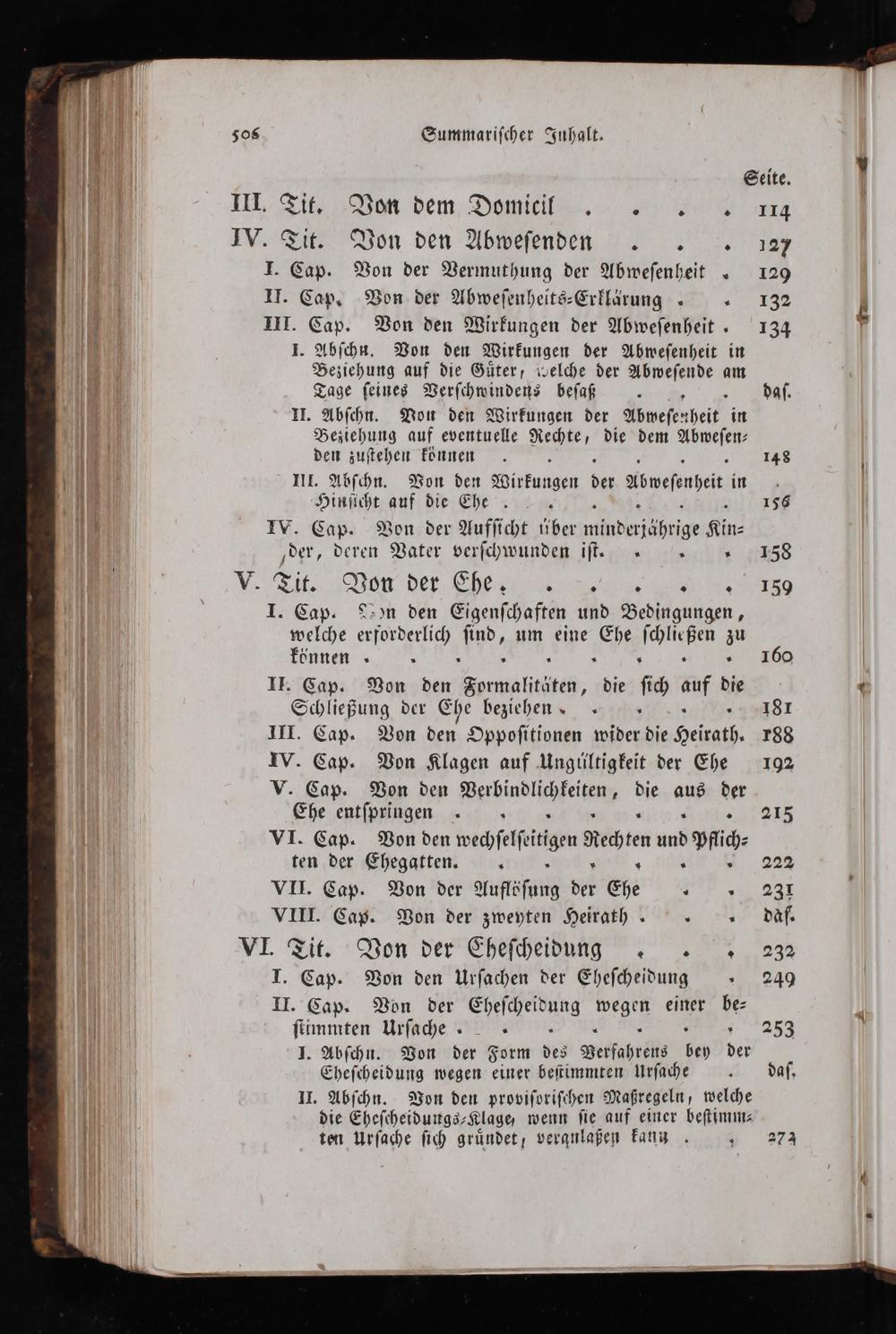 Seite. I, Tit Von dem Domiti W. Ei Von den Abſuben I. Cap. Von der Vermuthung der Abweſenheit„ 129 II. Cap. Von der Abweſenheits⸗Erklärung 12132 III. Cap. Von den Wirkungen der Abweſenheit. 134 I. Abſchn. Von den Wirkungen der Abweſenheit in Beziehung auf die Guͤter, welche der Abweſende am Tage ſeines Verſchwindens beſaß IH. Abſchn. Von den Wirkungen der Abweſenheit in Beziehung auf eventuelle Rechte, die dem den zuſtehen können 148 III. Abſchn. Von den Wirkungen neſhen Hinſicht auf die Ehe. 156 IW. Cap. Von der Aufſicht über Kin⸗ der, deren Vater verſchwunden iſt.„ 158 V Si. Von der I. Cap. Aon den Eigenſchaften und Bedingungen, welche erforderlich ſind, um eine Ehe K zu können„ 160 II. Cap. Von den Fomalititen, die ſich u die Schließung der Ehe beziehen 81 II. Cap. Von den Oppoſitionen wider die Heirath. 783 W. Cap. Von Klagen auf Ungüiltigkeit der Ehe 192 V. Cap. Von den Ftinvlſeitan die aus 1 Ehe entſpringen„ 215 VI. Cap. Von den ſin Rechten an pfich⸗ ten der Ehegatten.. VII. Cap. Von der Auftöſung Sh VIII. Cap. Von der zweyten Heirath„„ daf. VI. Tit. Von der Eheſcheidung„232 I. Cap. Von den Urſachen der Eheſcheidung„ 249 II. Cap. Von der einer be⸗ ſtimmten Urſache„ 3 253