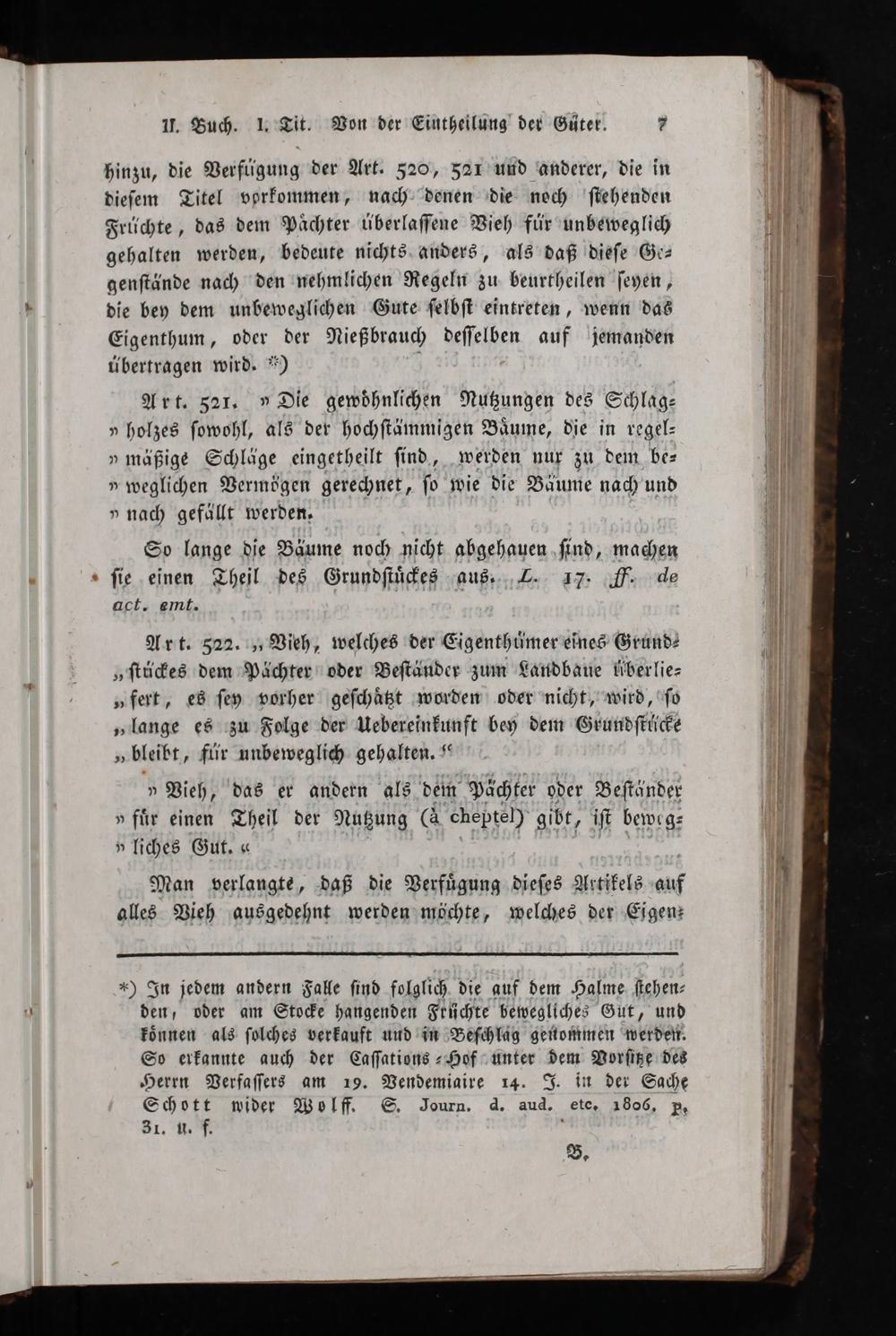 *) In jedem andern Falle ſind folglich die guf dem Halme ſtehen⸗ den, oder am Stocke hangenden Früchte bewegliches Gut, und koͤnnen als ſolches verkauft und in Beſchlag genommen werden. So erkannte auch der Caſſations⸗Hof unter dem Vorſitze des Herrn Verfaſſers am 19. Vendemiaire 14. J. in der Sache Schott wider Wolff. S. Journ. d. aud. ete, 1806. p. 31.. f