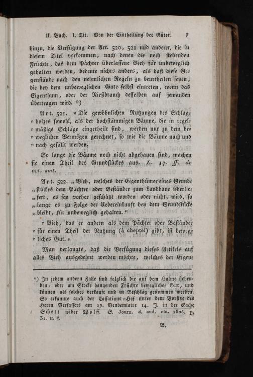 hinzu, die Verfügung der Art. 520,§a1 und anderer, die in dieſem Titel vorkommen, nach denen die noch ſtehenden Früchte, das dem Paͤchter überlaſſene Vieh für unbeweglich gehalten werden, bedeute nichts anders, als daß dieſe Ge⸗ genſtände nach den nehmlichen Regeln zu beurtheilen ſeyen, die bey dem unbeweglichen Gute ſelbſt eintreten, wenn das Eigenthum, oder der Nießbrauch deſſelben auf jemanden übertragen wird.*)