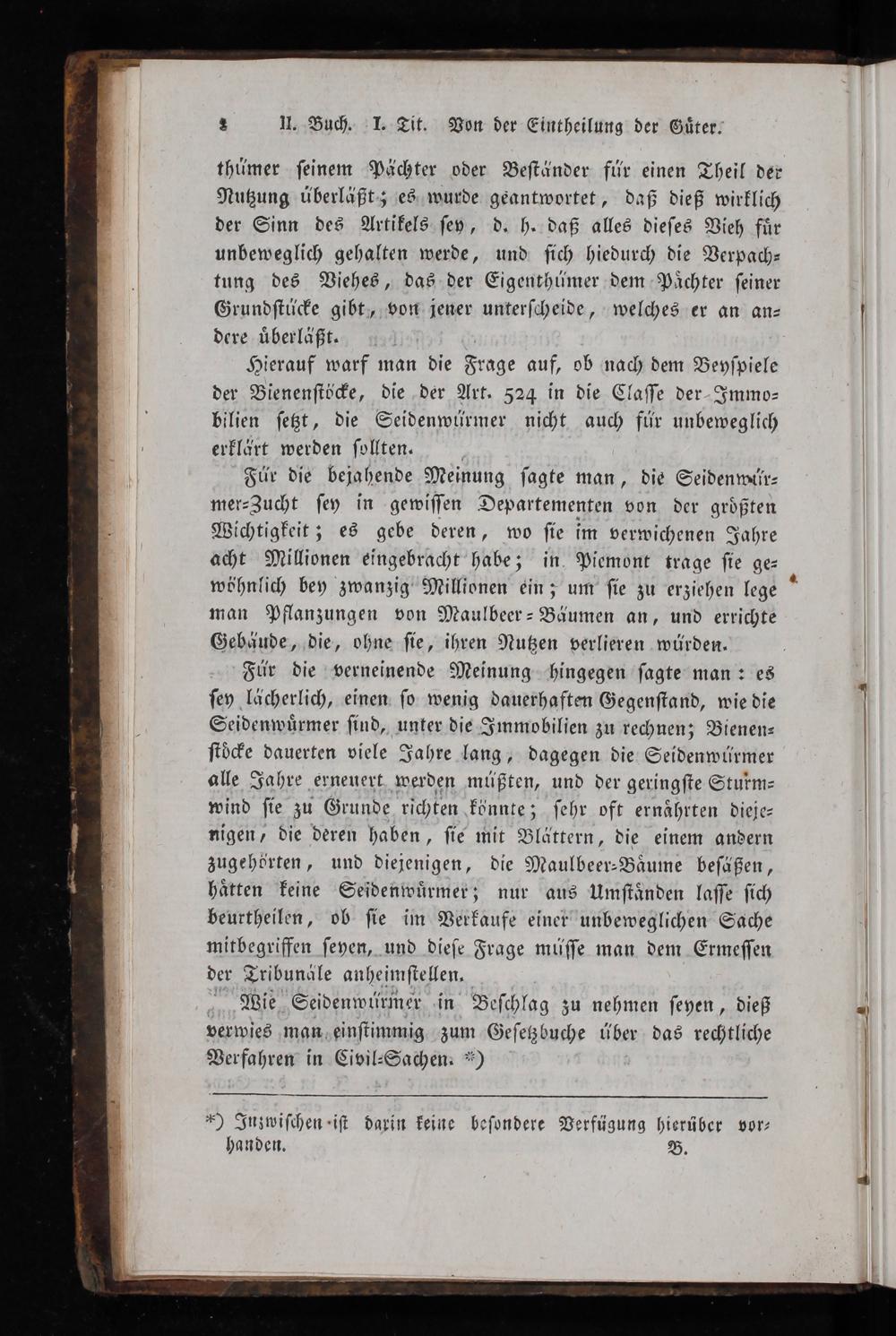 Für die verneinende Meinung hingegen ſagte man: es ſey lächerlich, einen ſo wenig dauerhaften Gegenſtand, wie die Seidenwuͤrmer ſind, unter die Immobilien zu rechnen; Bienen⸗ ſtoͤcke dauerten viele Jahre lang, dagegen die Seidenwürmer alle Jahre erneuert werden müßten, und der geringſte Sturm⸗ wind ſie zu Grunde richten könnte; ſehr oft ernaͤhrten dieje⸗ nigen/ die deren haben, ſie mit Blättern, die einem andern zugehörten, und diejenigen, die Maulbeer⸗Baͤume beſäßen, haͤtten keine Seidenwuͤrmer; nur aus Umſtaͤnden laſſe ſich beurtheilen, ob ſie im Verkaufe einer unbeweglichen Sache mitbegriffen ſeyen, und dieſe Frage müſſe man dem Ermeſſen der Tribunäle anheimſtellen.