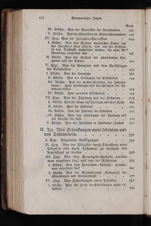 .„ 293 III, Abſchn. Von der Zahlung der Schulden. IV. Abſchn. Von den Wirkungen der Theilung und der Gewähr der Loſe„ 5 321 V. Abſchn. Von der Reſciſſion in Sachen 327 II. Tit. Von Schenkungen unter Lebenden und 1 voß ſigte I. Cap. Allgemeine Verfügungen II. Cap. Von der Fähigkeit durch Schenkung unter Lebenden oder durch Teſtament zu eitige oder begünſtiget zu werden„„ III. Cap. Von dem Vermögens⸗ Antheile, woruͤber 1 man verordnen darf, und von der Reduction„ 365 1 I. Abſchn. Von dem Sni worüber 11 man verordnen darf.. daſ. 3 1. Abſchn. Von der Sceni ceduetien) 3.