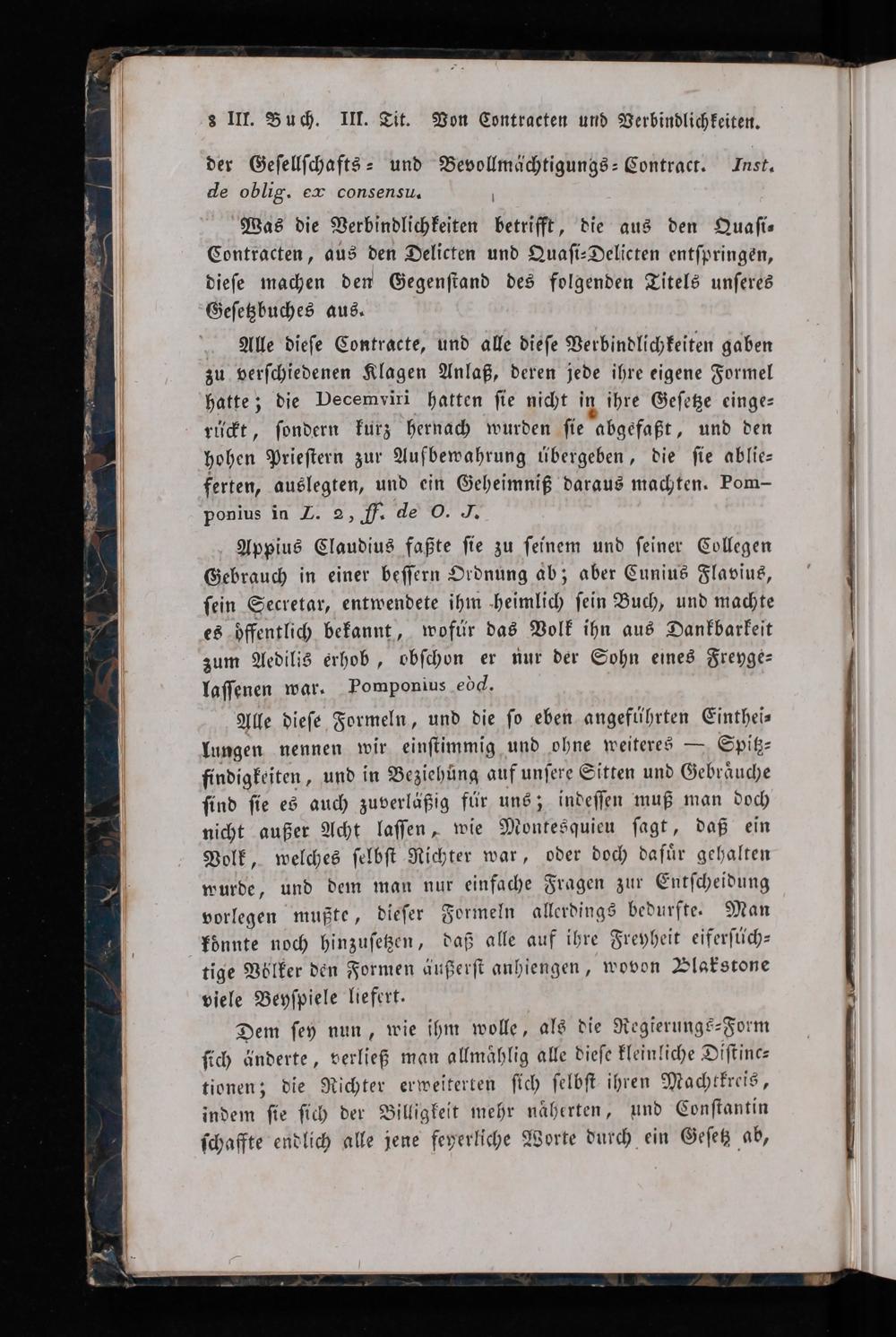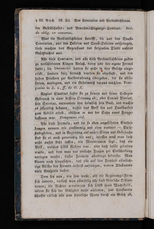 Alle dieſe Contracte, und alle dieſe Verbindlichkeiten gaben zu verſchiedenen Klagen Anlaß, deren jede ihre eigene Formel hatte; die Pecemviri hatten ſie nicht in ihre Geſetze einge⸗ ruüͤckt, ſondern kurz hernach wurden ſie abgefaßt, und den hohen Prieſtern zur Aufbewahrung übergeben, die ſie ablie⸗ ferten, auslegten, und ein Geheimniß daraus machten. Pom- ponius in T.
