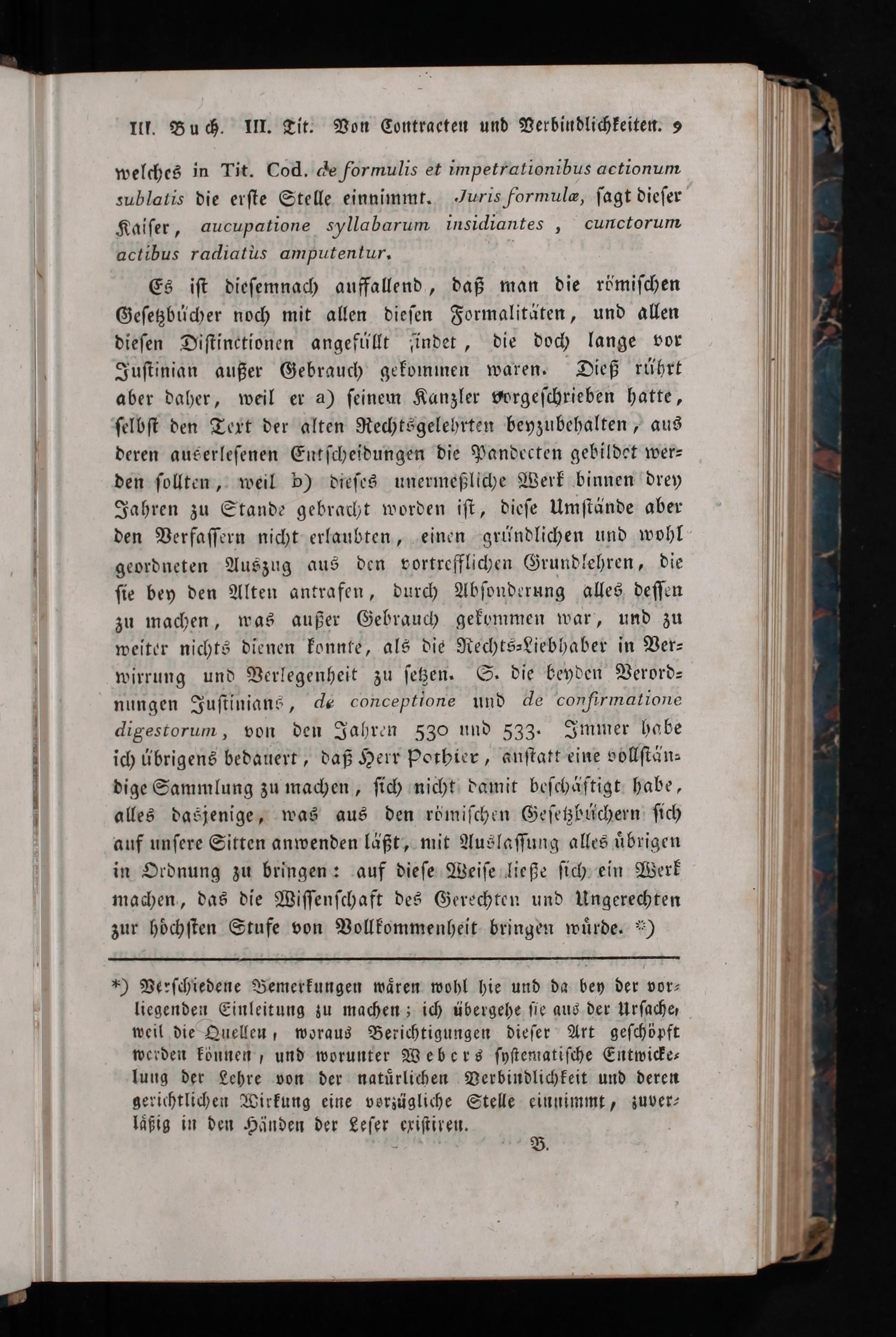 Es iſt dieſemnach auffallend, daß man die römiſchen Geſetzbücher noch mit allen dieſen Formalitäten, und allen dieſen Diſtinetionen angefüllt ſindet, die doch lange vor Juſtinian außer Gebrauch gekominen waren. Dieß rührt aber daher, weil er a) ſeinem Kanzler vorgeſchrieben hatte, ſelbſt den Text der alten Rechtsgelehrten beyzubehalten, aus deren auserleſenen Entſcheidungen die Pandecten gebildet wer⸗ den ſollten, weil b) dieſes unermeßliche Werk binnen drey Jahren zu Stande gebracht worden iſt, dieſe Umſtände aber den Verfaſſern nicht erlaubten, einen gründlichen und wohl geordneten Auszug aus den vortrefflichen Grundlehren, die ſie bey den Alten antrafen, durch Abſonderung alles deſſen zu machen, was außer Gebrauch gekommen war, und zu weiter nichts dienen konnte, als die Rechts⸗Liebhaber in Ver⸗ wirrung und Verlegenheit zu ſetzen. S. die beyden Verord⸗ nungen Juſtinians, de conceptione und de conſirmatione digestorum, von den Jahren 3530 und 533. Immer habe ich übrigens bedauert, daß Herr Pothier, anſtatt eine vollſtän⸗ dige Sammlung zu machen, ſich nicht damit beſchäſtigt habe, alles dasjenige, was aus den römiſchen Geſetzbüchern ſich auf unſere Sitten anwenden läßt, mit Auslaſſung alles uͤbrigen in Ordnung zu bringen: auf dieſe Weiſe ließe ſich ein Werk machen, das die Wiſſenſchaft des Gerechten und Ungerechten zur hoͤchſten Stufe von Vollkommenheit bringen wuͤrde.*)