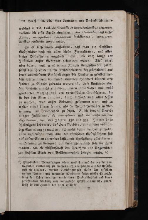 *) Verſchiedene Bemerkungen waͤren wohl hie und da bey der vor⸗ liegenden Einleitung zu machen; ich übergehe ſie aus der Urſache, weil die Quellen, woraus Berichtigungen dieſer Art geſchöpft werden können, und worunter Webers ſyſtematiſche Entwicke⸗ lung der Lehre von der natuͤrlichen Verbindlichkeit und deren gerichtlichen Wirkung eine vorzügliche Stelle einnimmt, zuver⸗ laßig in den Händen der Leſer exiſtiren.