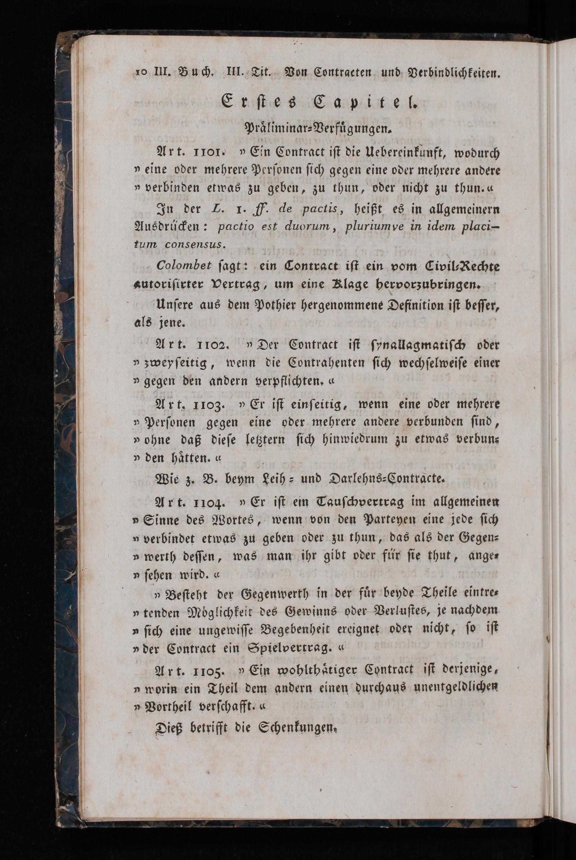 Art. 1Ior.»Ein Contract iſt die Uebereinkunft, wodurch „eine oder mehrere Perſonen ſich gegen eine oder mehrere andere „verbinden etwas zu geben, zu thun, oder nicht zu thun.«