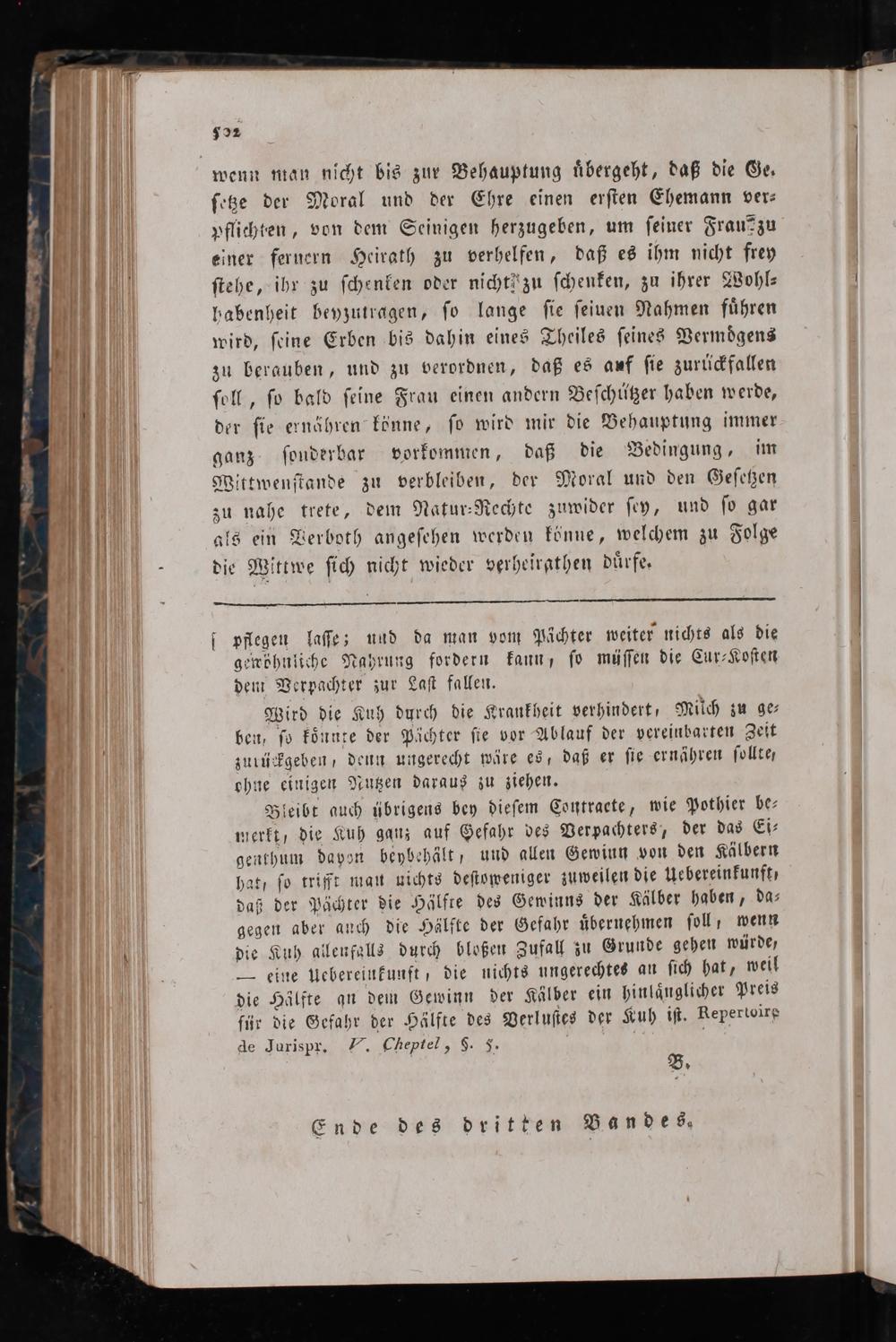 wenn man nicht bis zur Behauptung uͤbergeht, daß die Ge. ſetze der Moral und der Ehre einen erſten Ehemann ver⸗ pflichten, von dem Seinigen herzugeben, um ſeiner Frau?zu einer fernern Heirath zu verhelfen, daß es ihm nicht frey ſtehe, ihr zu ſchenken oder nichthzu ſchenken, zu ihrer Wohl⸗ habenheit beyzutragen, ſo lange ſie ſeiuen Nahmen fuͤhren wird, ſeine Erben bis dahin eines Theiles ſeines Vermoͤgens zu berauben, und zu verordnen, daß es auf ſie zurückfallen ſoll, ſo bald ſeine Frau einen andern Beſchützer haben werde, der ſie ernähren könne, ſo wird mir die Behauptung immer ganz ſonderbar vorkommen, daß die Bedingung, im Wittwenſtande zu verbleiben, der Moral und den Geſetzen zu nahe trete, dem Natur⸗Rechte zuwider ſey, und ſo gar als ein Verboth angeſehen werden könne, welchem zu Folge die Wittwe ſich nicht wieder verheirgthen duͤrfe.