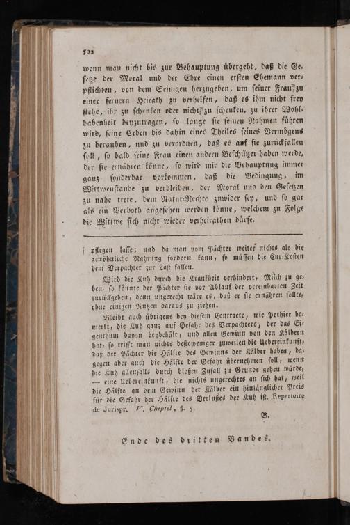 Bleibt auch übrigens bey dieſem Contraete, wie Pothier be— merkt, die Kuh ganz auf Gefahr des Verpachters, der das Ei⸗ genthum dayon beybehält, und allen Gewinn von den Kälbern hat, ſo trifft man nichts deſtoweniger zuweilen die Uebereinkunft, daß der Pöchter die Hälfre des Gewinns der Kälber haben, da⸗ gegen aber anch die Hälfte der Gefahr uͤbernehmen ſoll; wenn die Kuh allenfalls durch bloßen Zufall zu Grunde gehen würde, — eine uebereinkunft, die nichts ungerechtes an ſich hat, weil die Hälfte an dem Gewinn der Kälber ein hinlaͤnglicher Preis ſür die Gefahr der Hälfte des Verluſtes der Kuh iß. Reperteirs