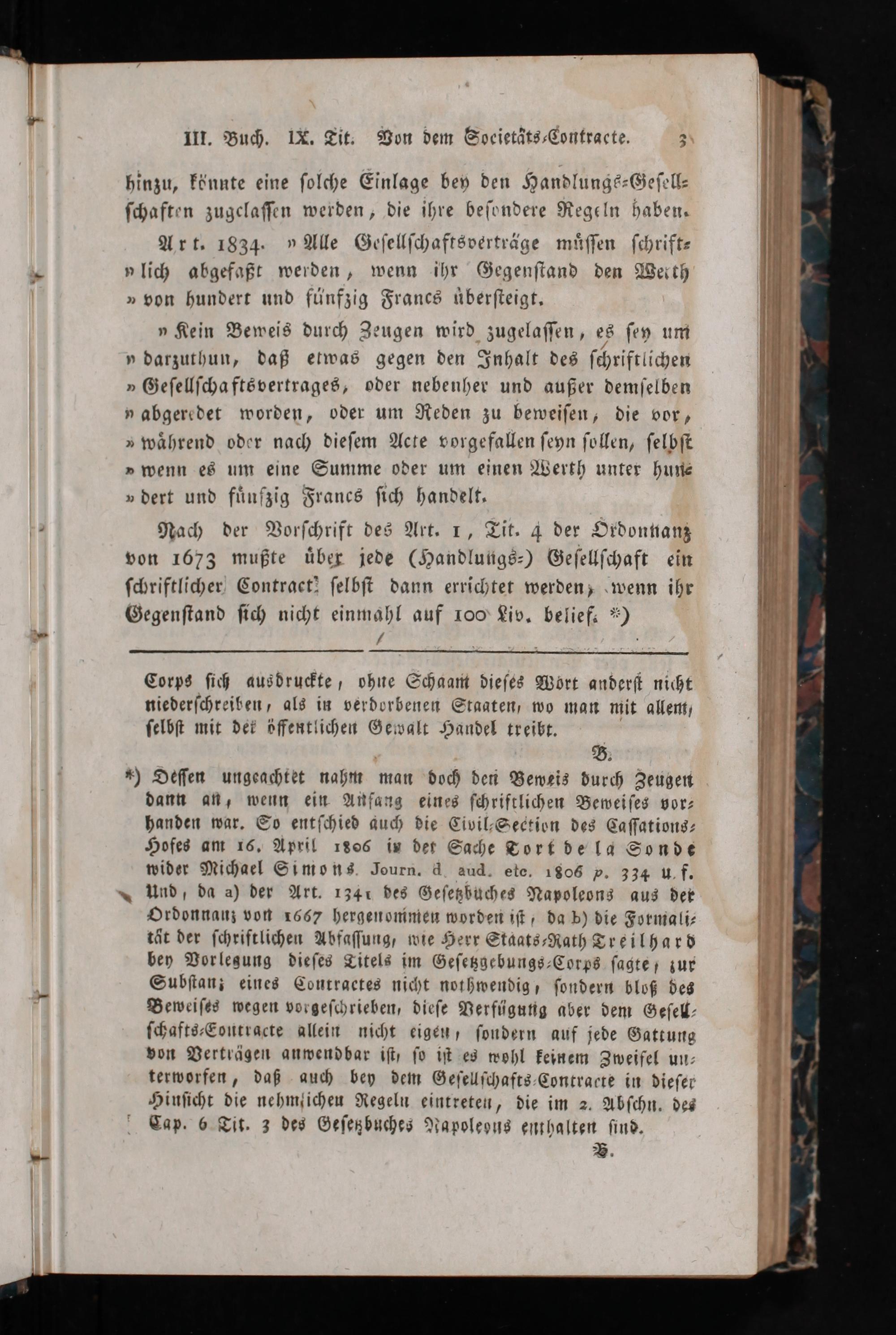 Ordonnanz von 1667 hergenonimen worden iſt, da b) die Formali⸗ tät der ſchriftlichen Abfaſſung, wie Herr Staats⸗Rath Treilhard bey Vorlesung dieſes Titels im Geſetzgebungs⸗Corps ſagte; zur Subſtanz eines Contraetes nicht nothwendig, ſondern bloß des Beweiſes wegen vorgeſchrieben, dieſe Verfügung aber dem Geſell⸗ ſchafts⸗Eontracte allein nicht eigen, ſondern auf jede Gattung von Verträgen anwendbar iſt, ſo iſt es wohl keinem Zweifel un⸗ terworfen, daß auch bey dem Geſellſchafts Contracte in dieſer Hinſicht die nehmſichen Regeln eintreten, die im 2. Abſchn. des Cap. 6 Cit. 3 des Geſetzbuches Napoleons enthalten ſind.