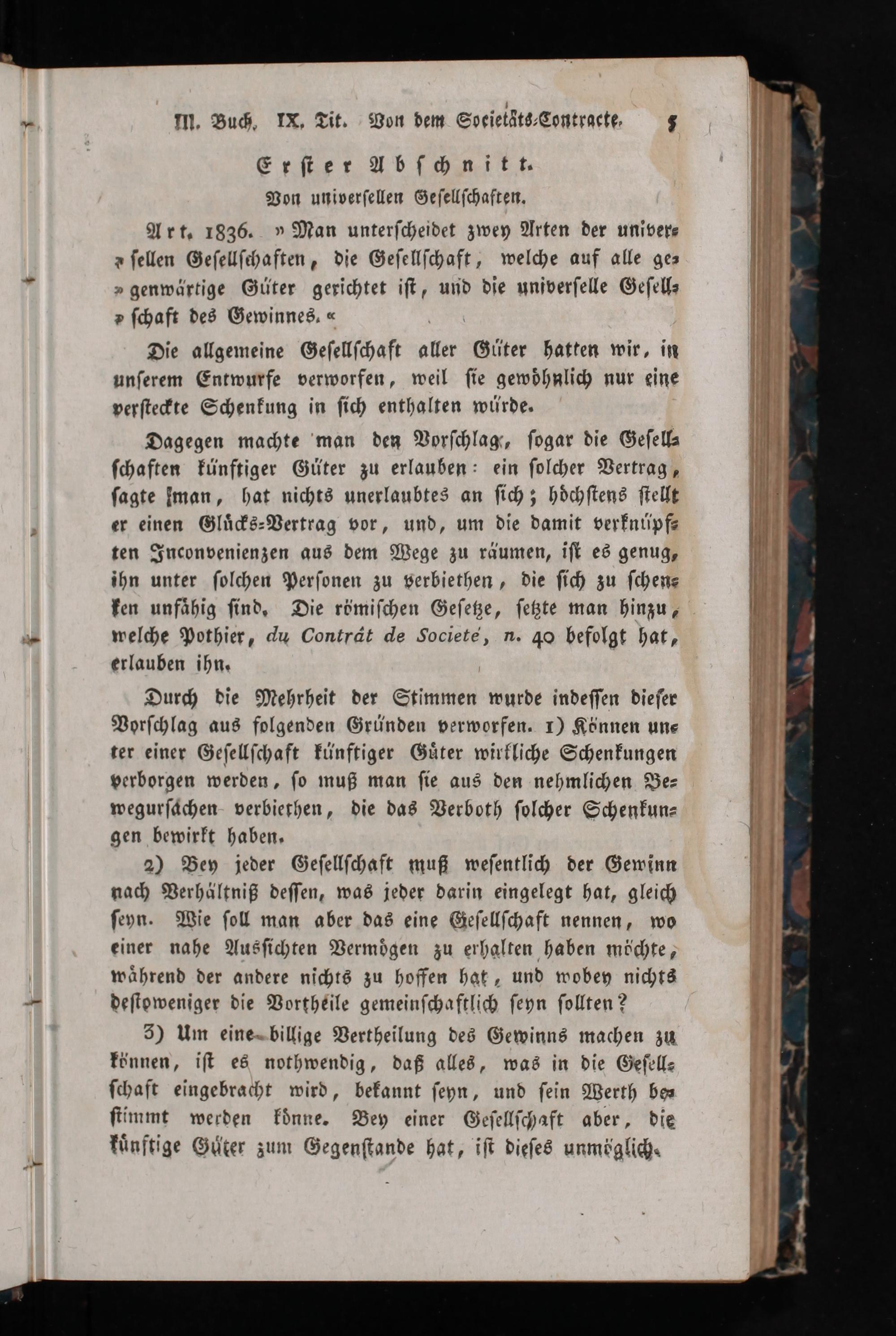 Art. 1836.»Man unterſcheidet zwey Arten der univer⸗ ſellen Geſellſchaften, die Geſellſchaft, welche auf alle ge⸗ „genwärtige Güter gerichtet iſt, und die unſverſelle Geſell⸗ „ſchaft des Gewinnes.«