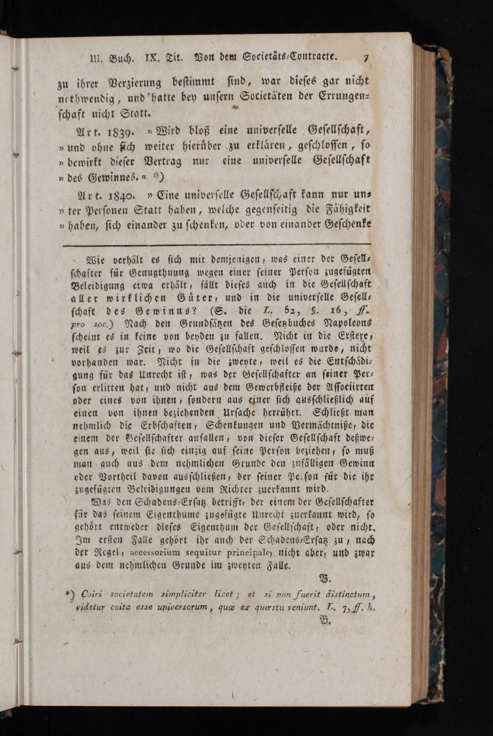 Art. 1830.»Wird bloß eine univerſelle Geſellſchaft, „und ohne ſich weiter hieruͤber zu erklaren, geſchloſſen, ſo „bewirkt dieſer Vertrag nur eine univerſelle Geſellſchaft „des Gewinnes.«*)