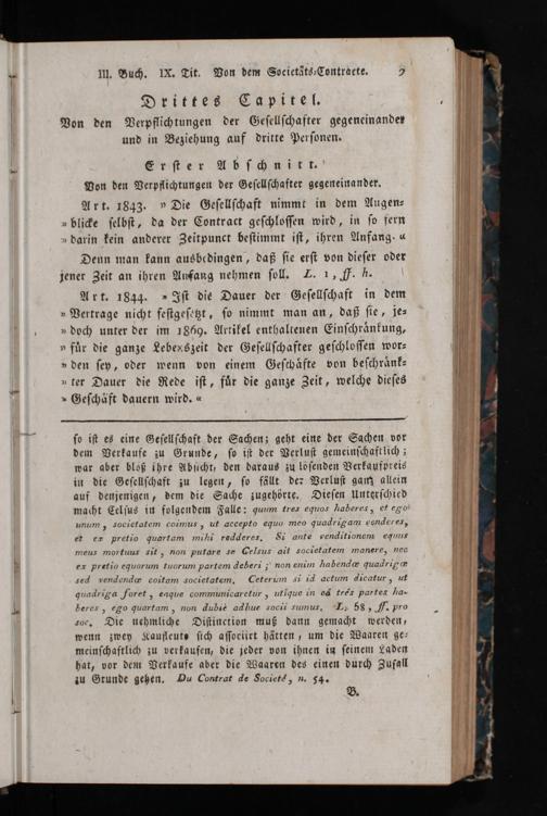 Art. 1844.»Iſt die Dauer der Geſellſchaft in dem „Vertrage nicht feſigeſetzt, ſo nimmt man an, daß ſie, je⸗ „doch unter der im 1869. Artikel enthaltenen Einſchraͤnkung, „fuͤr die ganze Lebenszeit der Geſellſchafter geſchloſſen wor⸗ „den ſey, oder wenn von einem Geſchaͤfte von beſchraͤnk⸗ „ter Dauer die Rede iſt, fuͤr die ganze Zeit, welche dieſes »Geſchäft dauern wird.«