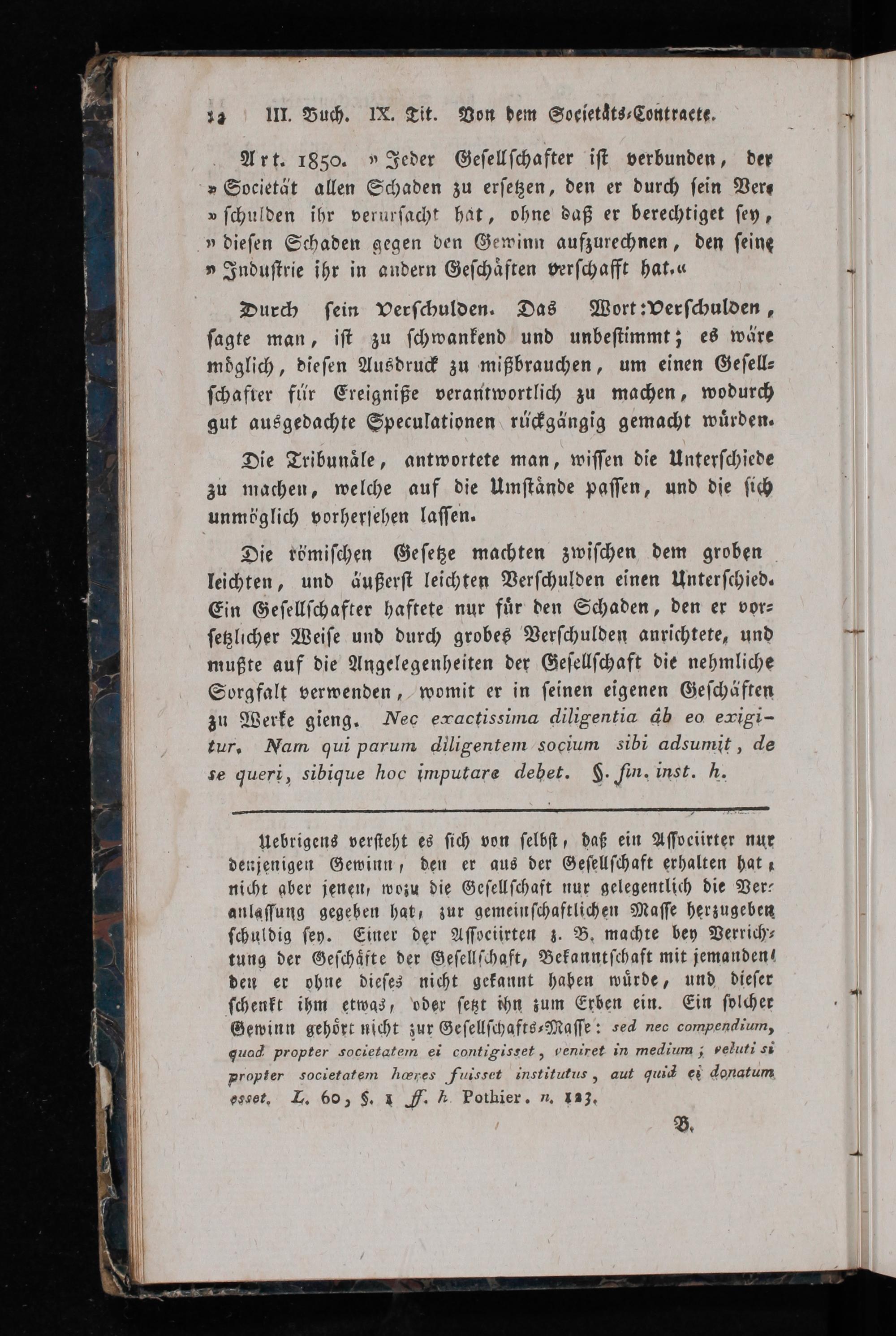 Die römiſchen Geſetze machten zwiſchen dem groben leichten, und äußerſt leichten Verſchulden einen Unterſchied⸗ Ein Geſellſchafter haftete nur fuͤr den Schaden, den er vor⸗ ſetzlicher Weiſe und durch grobes Verſchulden anrichtete, und mußte auf die Angelegenheiten der Geſellſchaft die nehmliche Sorgfalt verwenden, womit er in ſeinen eigenen Geſchäften zu Werke gieng. Mec ewactissima diligentia db eo ewigi- tur. Nam qui parum diligentem socium Sibi adsumit, de se queri, sibique hoc imputare debet. F. Rn. inst. h.