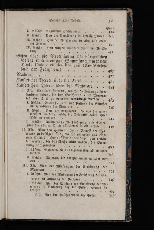 2.. 457 Geſetz uͤber die Vereinigung der buͤrgerlichen Geſetze in eine einzige Sammlung unter dem Titel: Code civil des Frangais(Civil⸗Geſetz⸗ buch der Frntoſeh)% Nachira Kaiſerliches Decret uͤber die Titel„ 481 Kaiſerliches Decret uͤber die Majotate.. 484 I. Tit. Von den Formen, welche diejenigen zu beo⸗ bachten haben, die bey Errichtung eines Majora⸗ tes ihre Titel zu vererben ermaͤchtigt werden„ 485 1. Abſchn. Bildung, Form und Prüfung des Geſuches um Errichtung der Majorate 3 2 1I. Abſchn. Von den Majokaten, die von penjenigen errichtet werden, welche die Befugniß haben ihren Titel zu vererben. 436 Ul Abſchn. Ablieferung, Verkuͤndigung, und Eintra⸗ gung der offenen Briefe(Diplome) in die Regiſter II. Tit. Von den Formen, die in Vetreff der Ma⸗ jorate zu befolgen ſind, welche entweder aus eige⸗ nem Antrieb, oder auf Verlangen derjenigen errich⸗ tet werden, die das Recht nicht haben, die Verer⸗ bung nachhüſichen I. Abſchn. Majorate, die aus eigenem Antrieb errichtet