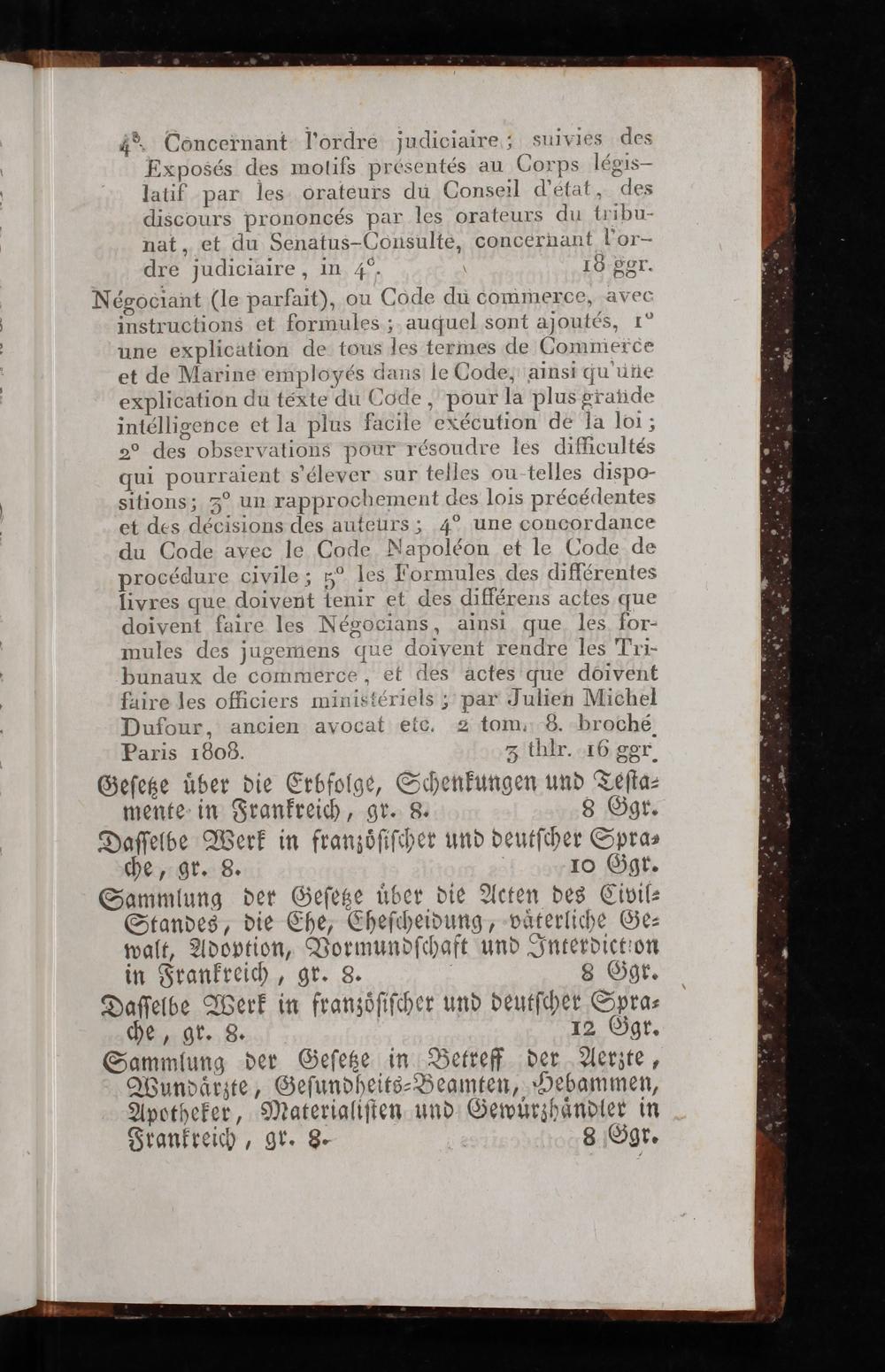 48. Concernant l'ordre judiciaire; suivies des Exposés des molifs présentés au Coyps légis- latik par les orateurs du Conseil d'etat, des discours prononcés par les orateurs du tribu- nat, et du Senatus-Consulte, concernant Uor- dre judiciaire, in 40. 18 ggr. Négociant(le parfait), ou Code du commerce, avec instructions et formules; auquel sont ajoutés, 1° une explication de tous les termes de Commerde et de Marine employés dans le Code, ainsi qu'une explication du texte du Code, pour la plus grande intélligence et la plus facile exécution de la loi; 2⁰ des observations pour résoudre les difficultés qui pourraient s'élever sur telles ou telles dispo- sitions; 3o un rapprochement des lois précédentes et des décisions des auteurs; 4“ une concordance du Code avec le Code Napoléon et le Code de procédure civile; 5 les Formules des différentes livres que doivent tenir et des différens actes que doivent faire les Négocians, ainsi que les for- mules des jugemens que doivent rendre les Tri- bunaux de commerce, et des actes que doivent fuire les officiers ministériels; par Julien Michel Dufour, ancien avocat etec. 2 tom. 8. broché Paris 1808. 5 thlr. 16 ggr. Geſetze uͤber die Erbfolge, Schenkungen und Teſta⸗ mente in Frankreich, gr. 8. 8 Ggr. Daſſelbe Werk in franzoͤſiſcher und deutſcher Spra⸗ che, gr. 8. 10 Ggr.
