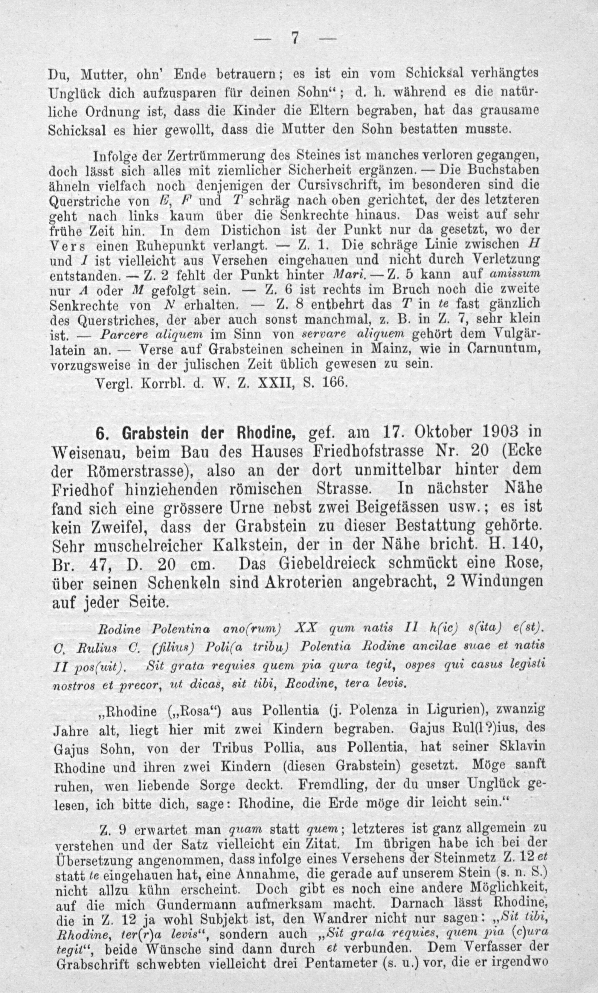 Z. 9 erwartet man quam statt quem; letzteres ist ganz allgemein zu verstehen und der Satz vielleicht ein Zitat. Im übrigen habe ich bei der Ubersetzung angenommen, dass infolge eines Versehens der Steinmetz Z. 12 et statt te eingehauen hat, eine Annahme, die gerade auf unserem Stein(s. n. S.) nicht allzu kühn erscheint. Doch gibt es noch eine andere Möglichkeit, auf die mich Gundermann aufmerksam macht. Darnach lässt Rhodine, die in Z. 12 ja wohl Subjekt ist, den Wandrer nicht nur sagen:„Sit tibi, Rhodine, ter(r)a levis“, sondern auch„Sit grata reguies, quem pia(c)ura tegitee, beide Wünsche sind dann durch et verbunden. Dem Verfasser der Grabschrift schwebten vielleicht drei Pentameter(s. u.) vor, die er irgendwo