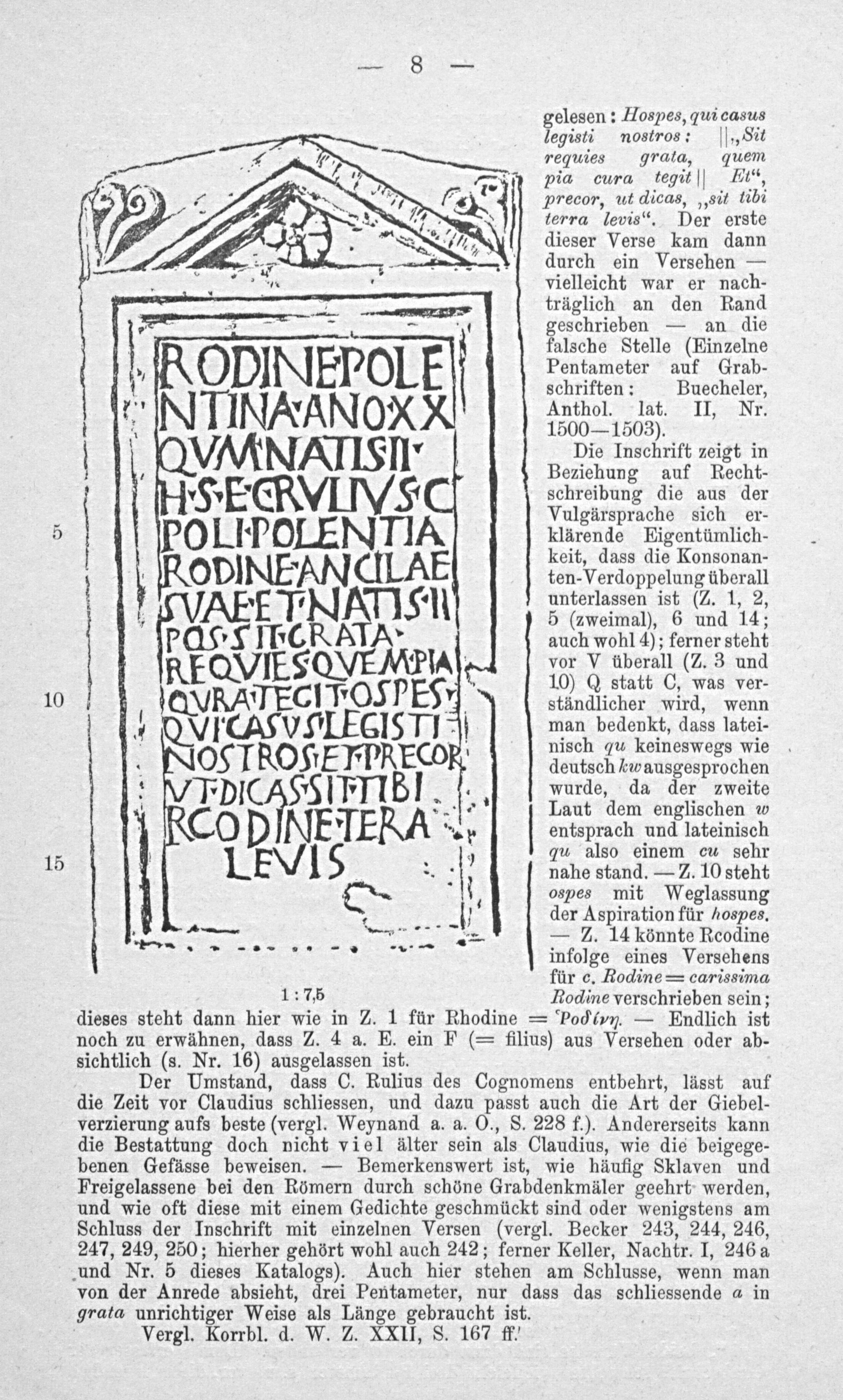 Der Umstand, dass C. Rulius des Cognomens entbehrt, lässt auf die Zeit vor Claudius schliessen, und dazu passt auch die Art der Giebel- verzierung aufs beste(vergl. Weynand a. a. O., S. 228 f.). Andererseits kann die Bestattung doch nicht viel älter sein als Claudius, wie die beigege- benen Gefässe beweisen.— Bemerkenswert ist, wie häufig Sklaven und Freigelassene bei den Römern durch schöne Grabdenkmäler geehrt werden, und wie oft diese mit einem Gedichte geschmückt sind oder wenigstens am Schluss der Inschrift mit einzelnen Versen(vergl. Becker 243, 244, 246, 247, 249, 250; hierher gehört wohl auch 242; ferner Keller, Nachtr. 1, 246a und Nr. 5 dieses Katalogs). Auch hier stehen am Schlusse, wenn man von der Anrede absieht, drei Pentameter, nur dass das schliessende a in grata unrichtiger Weise als Länge gebraucht ist.