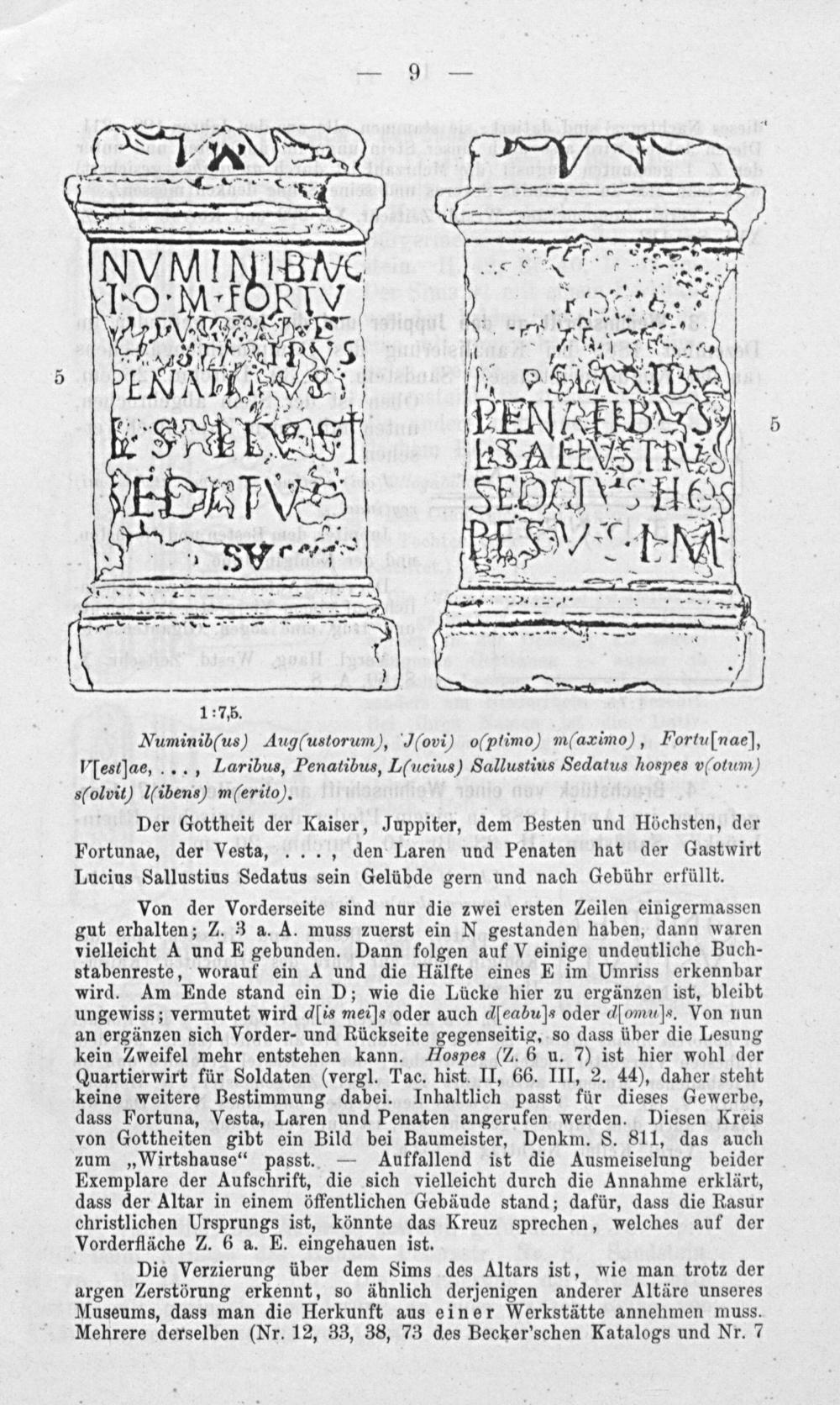 1:7,5. Numinib(us) Augustorum), Tovi) oſptimo) m(aæimo), Fortulnae], VIestlae,..., Laribus, Penatibus, Lſucius) Sallustius Sedatus hospes votumn] s(olvit) Iſibens) m(erito). Der Gottheit der Kaiser, Juppiter, dem Besten und Höchsten, der Fortunae, der Vesta,... den Laren und Penaten hat der Gastwirt Lucius Sallustius Sedatus sein Gelübde gern und nach Gebühr erfüllt.
