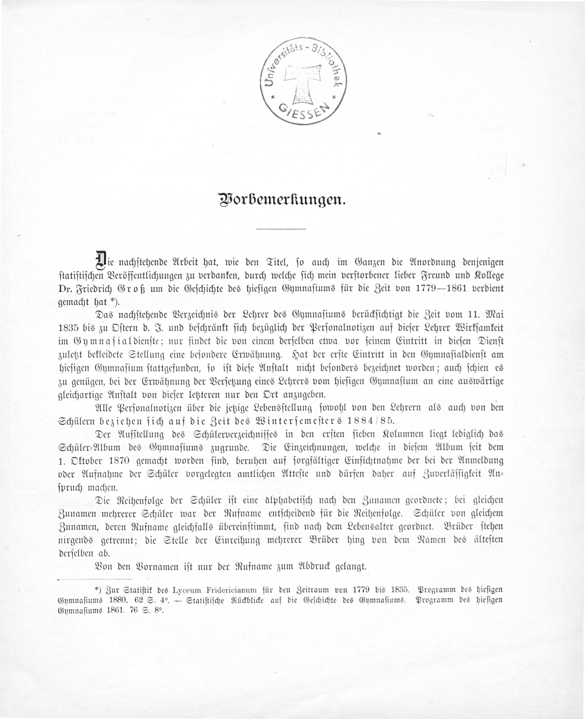 D nachſtehende Arbeit hat, wie den Titel, ſo auch im Ganzen die Anordnung denjenigen ſtatiſtiſchen Veröffentlichungen zu verdanken, durch welche ſich mein verſtorbener lieber Freund und Kollege Dr. Friedrich Groß um die Geſchichte des hieſigen Gymnaſiums für die Zeit von 1779—1861 verdient gemacht hat*).