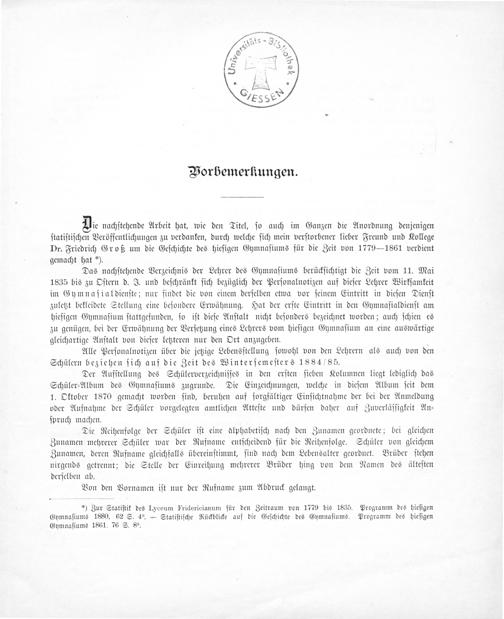 Der Aufſtellung des Schülerverzeichniſſes in den erſten ſieben Kolumnen liegt lediglich das Schüler-Album des Gymnaſiums zugrunde. Die Einzeichnungen, welche in dieſem Album ſeit dem 1. Oktober 1870 gemacht worden ſind, beruhen auf ſorgfältiger Einſichtnahme der bei der Anmeldung oder Aufnahme der Schüler vorgelegten amtlichen Atteſte und dürfen daher auf Zuverläſſigkeit An⸗ ſpruch machen.