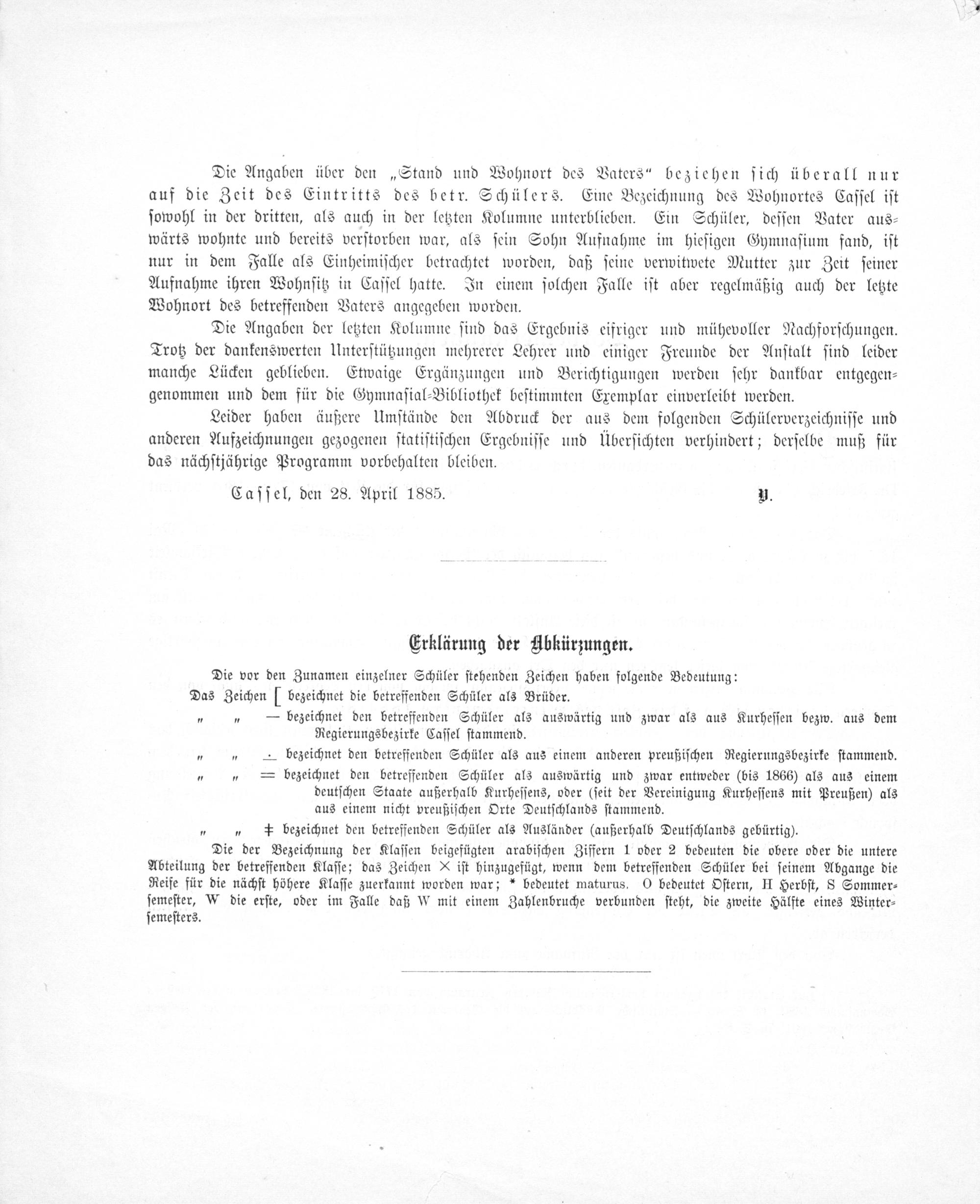 „„— bezeichnet den betreffenden Schüler als auswärtig und zwar als aus Kurheſſen bezw. aus dem Regierungsbezirke Caſſel ſtammend.