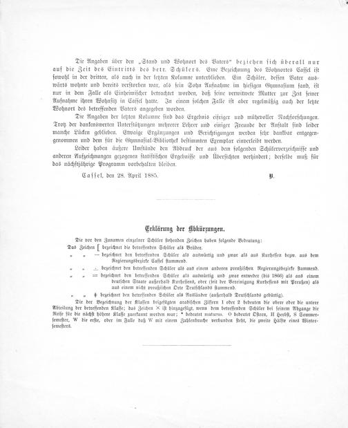 Die Angaben über den„Stand und Wohnort des Vaters“ beziehen ſich überall nur auf die Zeit des Eintritts des betr. Schülers. Eine Bezeichnung des Wohnortes Caſſel iſt ſowohl in der dritten, als auch in der letzten Kolumne unterblieben. Ein Schüler, deſſen Vater aus— wärts wohnte und bereits verſtorben war, als ſein Sohn Aufnahme im hieſigen Gymnaſium fand, iſt nur in dem Falle als Einheimiſcher betrachtet worden, daß ſeine verwitwete Mutter zur Zeit ſeiner Aufnahme ihren Wohnſitz in Caſſel hatte. In einem ſolchen Falle iſt aber regelmäßig auch der letzte Wohnort des betreffenden Vaters angegeben worden.