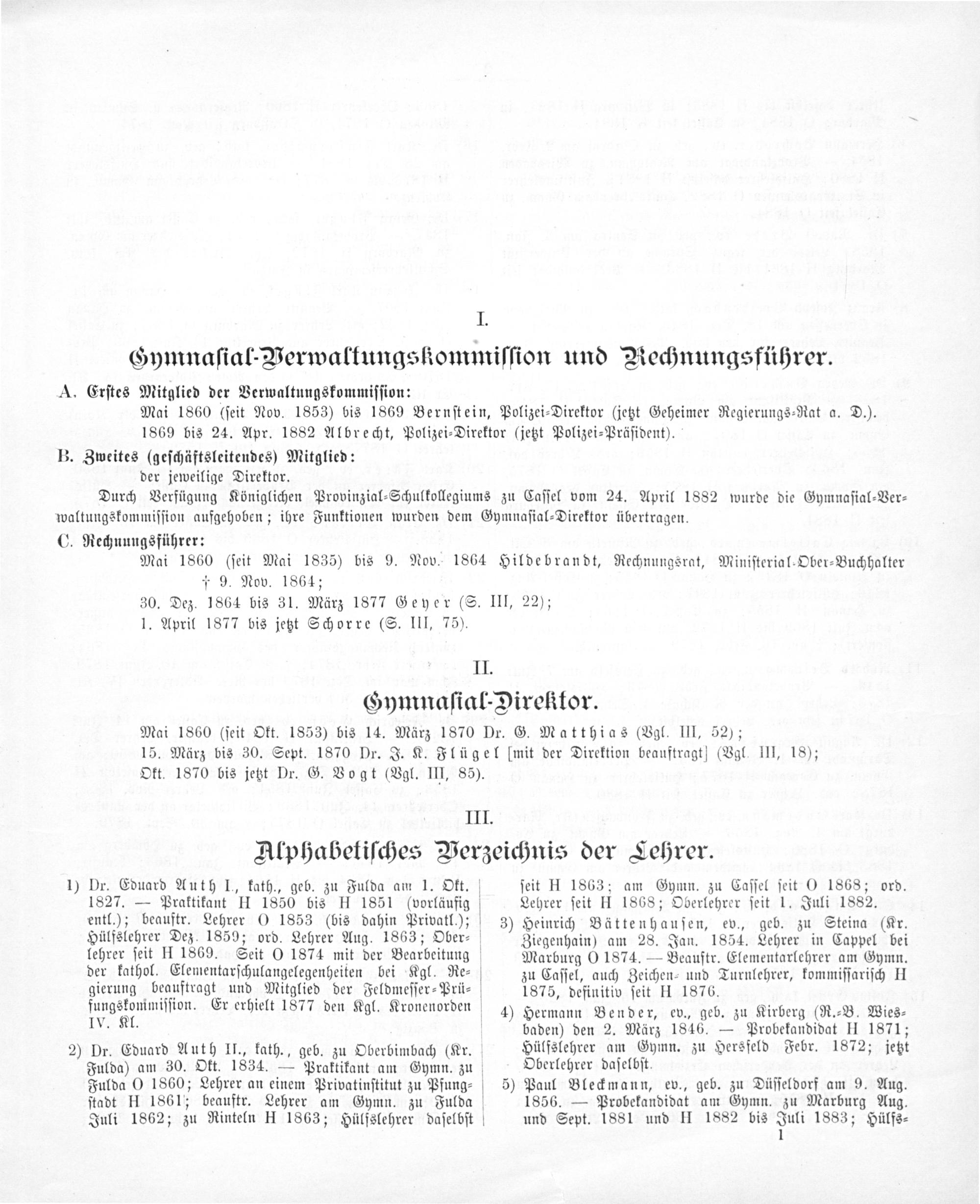 A. Erſtes Mitglied der Verwaltungskommiſſion: Mai 1860(ſeit Nov. 1853) bis 1869 Bernſtein, Polizei⸗Direktor(jetzt Geheimer Regierungs⸗Rat a. D.). 1869 bis 24. Apr. 1882 Albrecht, Polizei⸗Direktor(jetzt Polizei⸗Präſident). B. Zweites(geſchäftsleitendes) Mitglied: der jeweilige Direktor. Durch Verfügung Königlichen Provinzial⸗Schulkollegiums zu Caſſel vom 24. April 1882 wurde die Gymnaſial⸗Ver⸗ waltungskommiſſion aufgehoben; ihre Funktionen wurden dem Gymnaſial⸗Direktor übertragen. C. Rechnungsführer: Mai 1860(ſeit Mai 1835) bis 9. Nov. 1864 Hildebrandt, Rechnungsrat, Miniſterial⸗Ober⸗Buchhalter † 9. Nov. 1864; 30. Dez. 1864 bis 31. März 1877 Geyer(S. III, 22); 1. April 1877 bis jetzt Schorre(S. III, 75).
