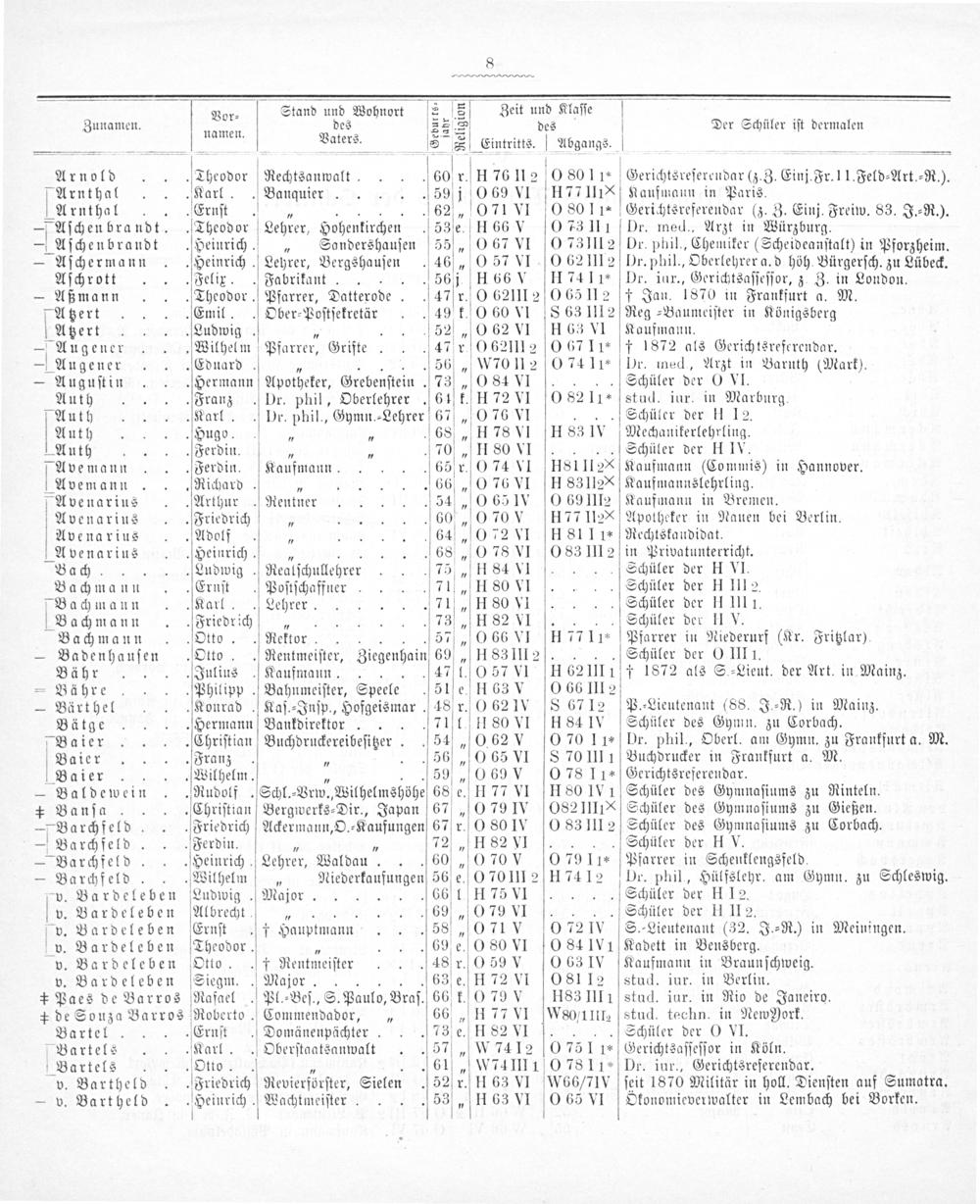 Bor⸗ Stand und Wohnort 2* Zeit und Klaſſe namen. des 2 des Vaters. 1 5 A Eintritts. V Abgangs. Theodor Rechtsanwalt.. 60 r. V H 76 I12 02 80 11* art. Banquier.. 59 j 6 69 VI H7VIIINX JErnſt..62„ 071 VI 0 8011“ Theodor Lehrer, Hohenkirchen 53 e. H66 V[0 73 111 .Heinrich.„ Sandershauſen 55„ 0 67 VI(0 731112 .Heinrich. Lehrer, Bergshauſen 46„0 57 VI O 62 III2 .Felix.. Fabrikant....56 j. H66 V H7RA4I1* .Theodor. Pfarrer, Datterode. 47 r. 0 621II2 0O 65 112 Emil.. Ober eeſtſekeltir 49 k. 0 60 vI S 63 1112 Ludwig. 52„0 62 N H 63 VI .Wilhelm Pfarrer, Grifte 47 r 0 621II2 0O 67 I1* Eduard.....56„W70 Il2 0 74 11* . Hermann Apotheker, Grebenſtein. 73„ 0 84 VI.. Franz Dr. phil, Oberlehrer. 64 k. H 72 VI[0 82 11* .Karl.. Dr. phil., Gymn.⸗Lehrer 67„0 76 VI.. „Hugo.,. 68„ H 78 VI HS3 IV .Ferdin. ᷑„„ 70„ H80 VL Ferdin. Kaufmann. 65 r. 0 74 VI HSI 112x .Richard.„ 66„ 0O 76 VI H83112 Arthur.Rentner 54„0 651v 0 69 2 . Friedrich„ 60„ 0 70 H7VT II2 . Adolf, 64„0O 72 VI HSIII* „Heinrich. 5.. 68„0 78 VI[083 III2 .Ludwig. Realſchullehrer 75„ H 84 VI Ernſt Poſtſchaffner. 711„ H 80 VI Karl. Lehrer.. 71„ HS0 VI „Friedrich„.[73„ H S2 VI... .Otto.. Rektor... 57„ 0 66 V1 H77 11* .Otto.. Rentmeiſter, Ziegenhain 69„H83 III2... .Julius. Kaufmann..47 1. 0 57 VI H 62III1 . Philipp. Bahnmeiſter, Speele 51 e. e. H63 V(066 III2 „Konrad. Kaſ.⸗Inſp., Hofgeismar. 48 r. 0 62 1Vv S 6712 . Hermann Bankdirektor. 71 I. H 80 VI H 84 IV .Chriſtian Buchdruckereibeſitzer. 54—„0 62 V 9 70 I1* ....56„0 65 VI S 70 IIII annaln. 5.. 3„ 0 69 V 078 I1- .Rudolf. Schl.⸗Vrw., Wilhelmshöhe 68 e. H77 VI H 80 IVI „Chriſtian Bergwerks⸗Dir., Japan 67„0 79 IV 082IIII . Friedrich Ackermann, O.⸗Kaufungen 67 r. 0 80 IV O 83 III 2 „Ferdin.„„ 72„ H S2 V „Heinrich Lehrer, Waldau 60„ 0 70 V 079 11 Wilhelm„ Niederkaufungen 56 e. O 70 III2 H7412 Ludwig. Major. 66 1H 75 VI Albrecht„. 69„079 V.. Ernſt. † Hauptmann. 58„ 0 71V[072 V Theodor. 69 e. 0 80 VI[0 84 1VI . 4 Rentmeiſter 48 r. 0 59 N(0O 63 V Siegm. Major... 63 e. H 72 VI O08112 Rafael. Pl.⸗Beſ., S. Paulo, Braſ. 66 k. 0 79 V HS3 III1 Roberto 3 Fümin rdor„ 66„H 77 VI WSO/1III. „Ernſt. Domänenpächter. 73 e. H 82 V „Karl.. Oberſtaatsanwalt 57„ W 74 12 07511- .Otio... 61„W74IHI1 0 7811- Sriedrich Revierförſter, Sielen. 52 r. II 63 VI W66/71V Heinrich. Wachtmeiſter.. 5„ H 63 VI O 65 VI