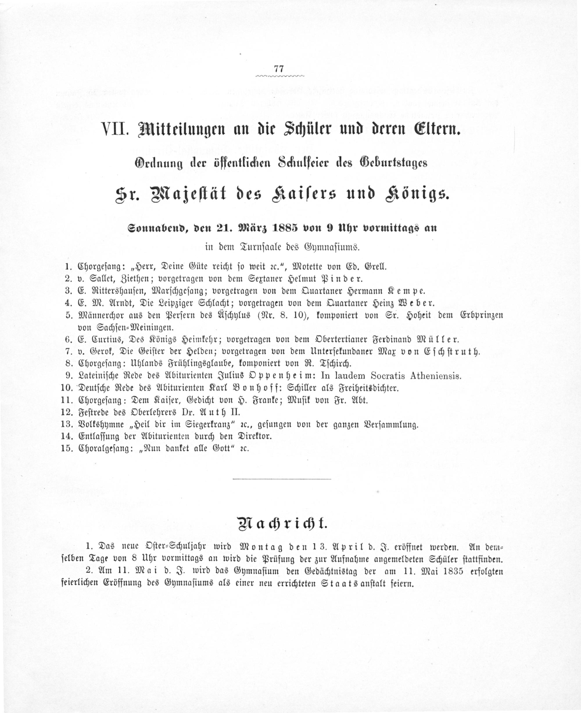 . Deutſche Rede des Abiturienten Karl Bonhofft Schiller als Freiheitsdichter. .Chorgeſang: Dem Kaiſer, Gedicht von H. Franke; Muſik von Fr. Abt.