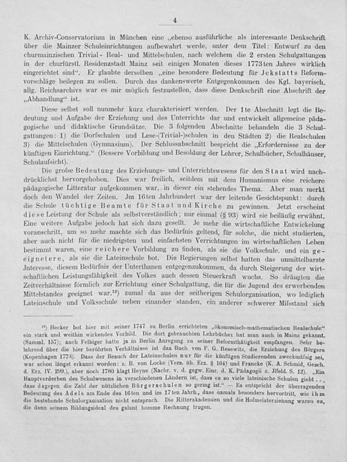 K. Archiv-Conservatorium in München eine„ebenso ausführliche als interessante Denkschrift über die Mainzer Schuleinrichtungen aufbewahrt werde, unter dem Titel: Entwurf zu den churmainzischen Trivial- Real- und Mittelschulen, nach welchem die 2 ersten Schulgattungen in der churfürstl. Residenzstadt Mainz seit einigen Monaten dieses 1773 ten Jahres wirklich eingerichtet sind'’. Er glaubte derselben„eine besondere Bedeutung für Jekstatts Reform- vorschläge beilegen zu sollen. Durch das dankenswerte Entgegenkommen des Kgl. bayerisch. allg. Reichsarchivs war es mir möglich festzustellen, dass diese Denkschrift eine Abschrift der „Abhandlung“ ist.