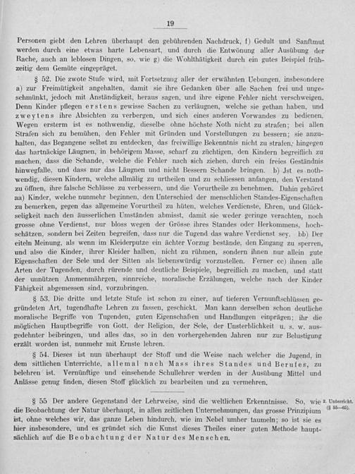 § 55 Der andere Gegenstand der Lehrweise, sind die weltlichen Erkenntnisse. So, wie die Beobachtung der Natur überhaupt, in allen zeitlichen Unternehmungen, das grosse Prinzipium ist, ohne welches wir, das ganze Leben hindurch, wie im Nebel umher taumeln; so ist sie es hier insbesondere, und es gründet sich die Kunst dieses Theiles einer guten Methode haupt- sächlich auf die Beoobachtung der Natur des Menschen.