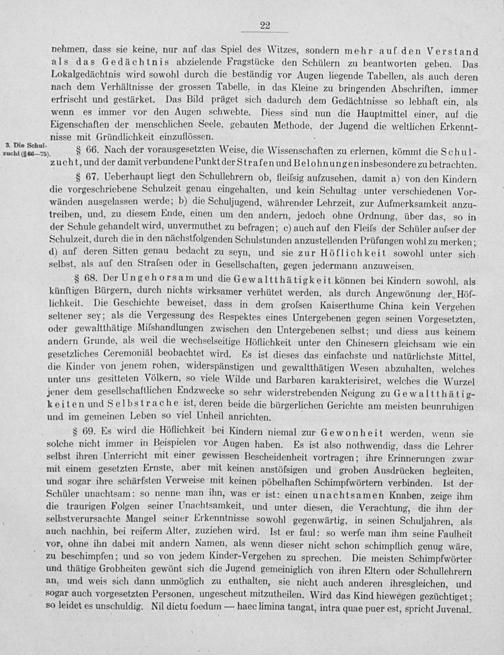 § 68. Der Ungehorsam und die Gewaltthätigkeit können bei Kindern sowohl. als künftigen Bürgern, durch nichts wirksamer verhütet werden, als durch Angewönung der. Höf- lichkeit. Die Geschichte beweiset, dass in dem groſsen Kaiserthume China kein Vergehen seltener sey; als die Vergessung des Respektes eines Untergebenen gegen seinen Vorgesetzten, oder gewaltthätige Milshandlungen zwischen den Untergebenen selbst; und diess aus keinem andern Grunde, als weil die wechselseitige Höflichkeit unter den Chinesern gleichsam wie ein gesetzliches Ceremoniäl beobachtet wird. Es ist dieses das einfachste und natürlichste Mittel, die Kinder von jenem rohen, widerspänstigen und gewaltthätigen Wesen abzuhalten, welches unter uns gesitteten Völkern, so viele Wilde und Barbaren karakterisiret, welches die Wurzel jener dem gesellschaftlichen Endzwecke so sehr widerstrebenden Neigung zu Gewaltthätig- keiten und Selbstrache ist, deren beide die bürgerlichen Gerichte am meisten beunruhigen und im gemeinen Leben so viel Unheil anrichten.