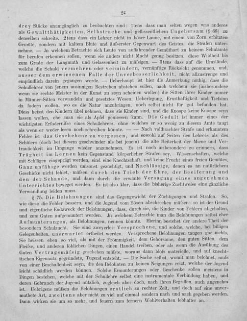 24 drey Stücke unumgänglich zu beobachten sind: Itens dass man selten wegen was anderes als Gewaltthätigkeiten, Selbstrache und geflissentlichem Ungehorsam(§ 68) zu denselben schreite. 2tens dass ein Lehrer nicht in böser Laune, mit einem von Zorn erhitzten Gemüte, sondern mit kaltem Blute und äulserster Gegenwart des Geistes, die Strafen unter-