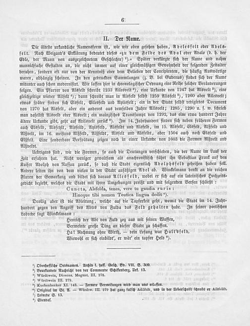 Uebrigens ſind, wie die Formen, ſo auch die Deutungen verſchieden, die der Name im Lauf der Zeit erfahren hat. Nicht weniger gewaltſam als anachroniſtiſch führt ihn Sebaſtian Frank auf den Kaiſer Adolph von Naſſau zurück, ſo daß die Stadt eigentlich Adolphsfeld geheißen haben ſoll. Andere leiten ihn von dem vielen in der Stadt anſäßigen Adel ab. Winckelmann denkt an die reichen Fluren der Gemarkung und bildet ſich daraus Allesfeld, wobei er ſich auf ein lateiniſches Hochzeits⸗ gedicht bezieht, welches die Stadt mit ihren Umgebungen preißt und mit folgenden Verſen ſchließt: