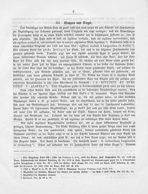 Das Stadtſiegel von Alsfeld finde ich zuerſt 1260 und dann weiter bis zum Schluſſe des Jahrhunderts zur Beglaubigung von Urkunden gebraucht, deren Originale mir nicht vorliegen; nach den Bemerkungen der Herausgeber hängt es an einem Theile derſelben entweder nur in beſchädigtem Zuſtande an, oder iſt ganz abgefallen. Im Texte wird es bald als sigillum civitatis, bald als sigillum universitatis, bald als sigillum sculteti et universitatis oder in anderer allgemeiner Weiſe bezeichnet ¹). Beſtimmter heißt es in einem richterlichen Vergleiche von 1305 und dann öfter: sigillum sculteti et burgensium(in Alsfelt) ²). Wir erkennen hierin das große Inſiegel der Stadt, das auch in den folgenden Jahrhunderten noch zuweilen gebraucht wurde. Dasſelbe zeigt uns eine ſitzende männliche Figur in ganzer Geſtalt, mit einem faltenreichen Gewand bekleidet: das Haupt iſt unbedeckt, das Kinn ohne Bart, über das obere Ende der Stirn zieht ſich eine kurze punctirte Linie, die indeſſen mit einer Krone nichts gemein hat; in der rechten Hand hält die Figur ein emporgerichtetes Schwert, in der linken eine flatternde Fahne; an ihr linkes Knie lehnt ſich ein dreieckiger, an den Seiten etwas geſchweifter Schild, auf welchem ein rechtsgewendeter, zum Grimme geſchickter und, wie es ſcheint, gekrönter Löwe mit gefiedertem, am Endbüſchel nach innen gekehrtem Schweife zu ſehen iſt. Die Mähne des Löwen iſt in ähnlicher Weiſe punctirt, wie der Haarrand der Figur. Um den zirkelrunden Rand des Siegels zieht ſich zwiſchen zwei punctirten Parallelkreiſen in ſehr alten Charakteren die Umſchrift: † S.SCVLTETI. ET.BVRI GESIV. I.ALSFELT ³). Dieſe Siegelform gehört in Territorialſtädten gewiß unter die ſehr ſeltenen.