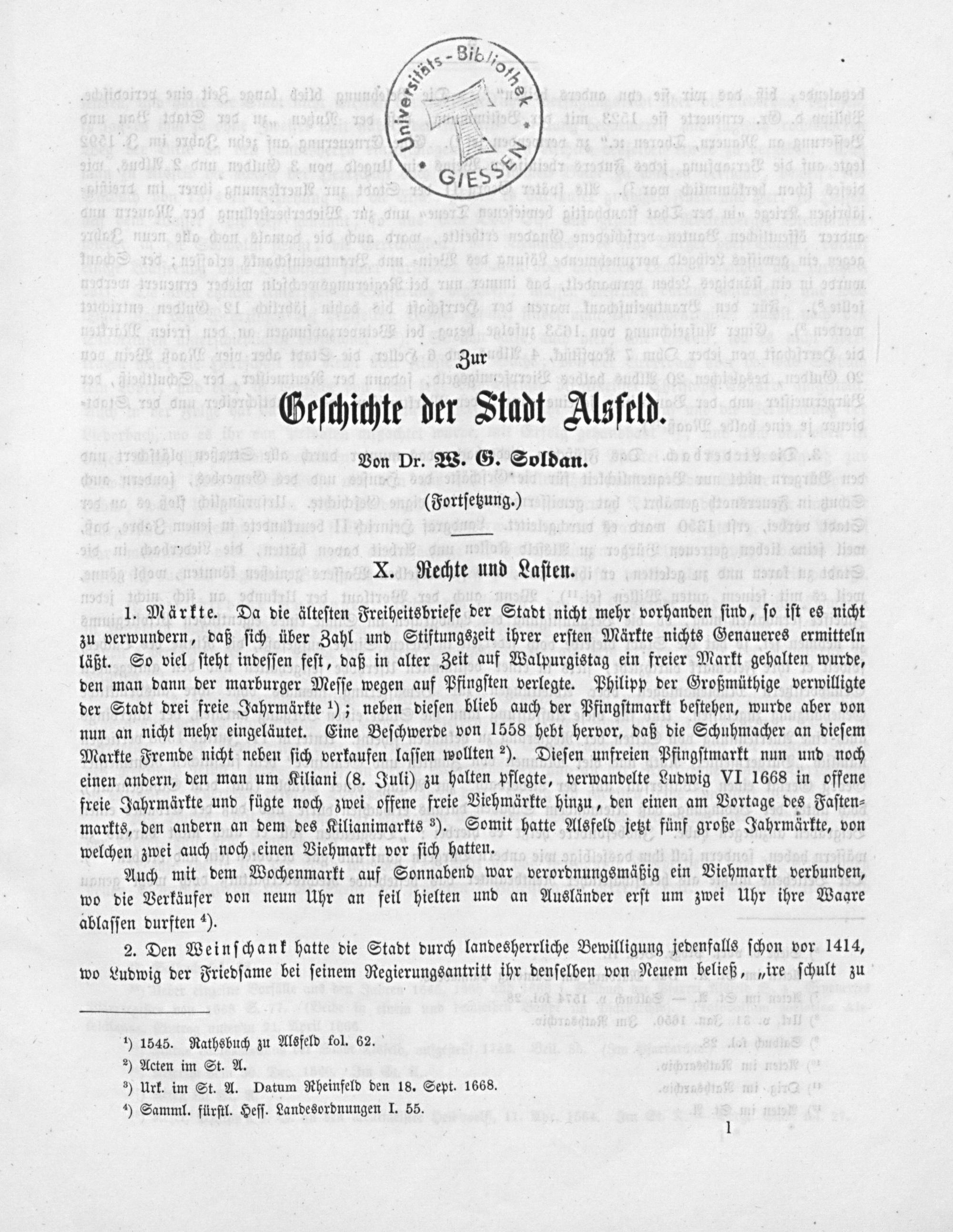 1. Märkte. Da die älteſten Freiheitsbriefe der Stadt nicht mehr vorhanden ſind, ſo iſt es nicht zu verwundern, daß ſich über Zahl und Stiftungszeit ihrer erſten Märkte nichts Genaueres ermitteln läßt. So viel ſteht indeſſen feſt, daß in alter Zeit auf Walpurgistag ein freier Markt gehalten wurde, den man dann der marburger Meſſe wegen auf Pfingſten verlegte. Philipp der Großmüthige verwilligte der Stadt drei freie Jahrmärkte ¹); neben dieſen blieb auch der Pfingſtmarkt beſtehen, wurde aber von nun an nicht mehr eingeläutet. Eine Beſchwerde von 1558 hebt hervor, daß die Schuhmacher an dieſem Markte Fremde nicht neben ſich verkaufen laſſen wollten ²). Dieſen unfreien Pfingſtmarkt nun und noch einen andern, den man um Kiliani(8. Juli) zu halten pflegte, verwandelte Ludwig VI 1668 in offene freie Jahrmärkte und fügte noch zwei offene freie Viehmärkte hinzu, den einen am Vortage des Faſten⸗ markts, den andern an dem des Kilianimarkts ³). Somit hatte Alsfeld jetzt fünf große Jahrmärkte, von welchen zwei auch noch einen Viehmarkt vor ſich hatten.