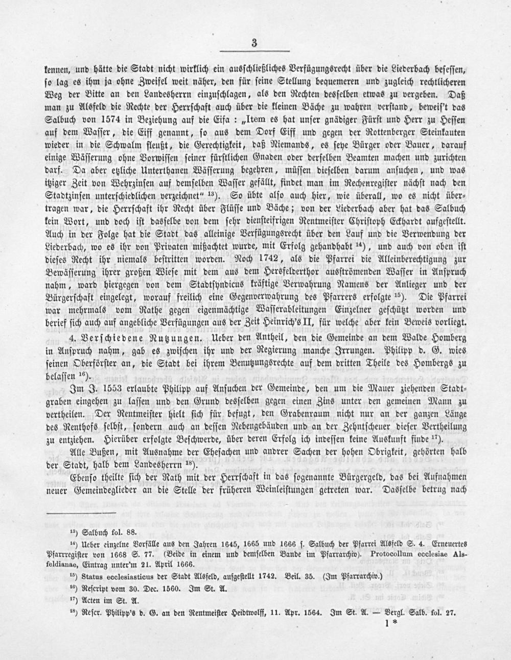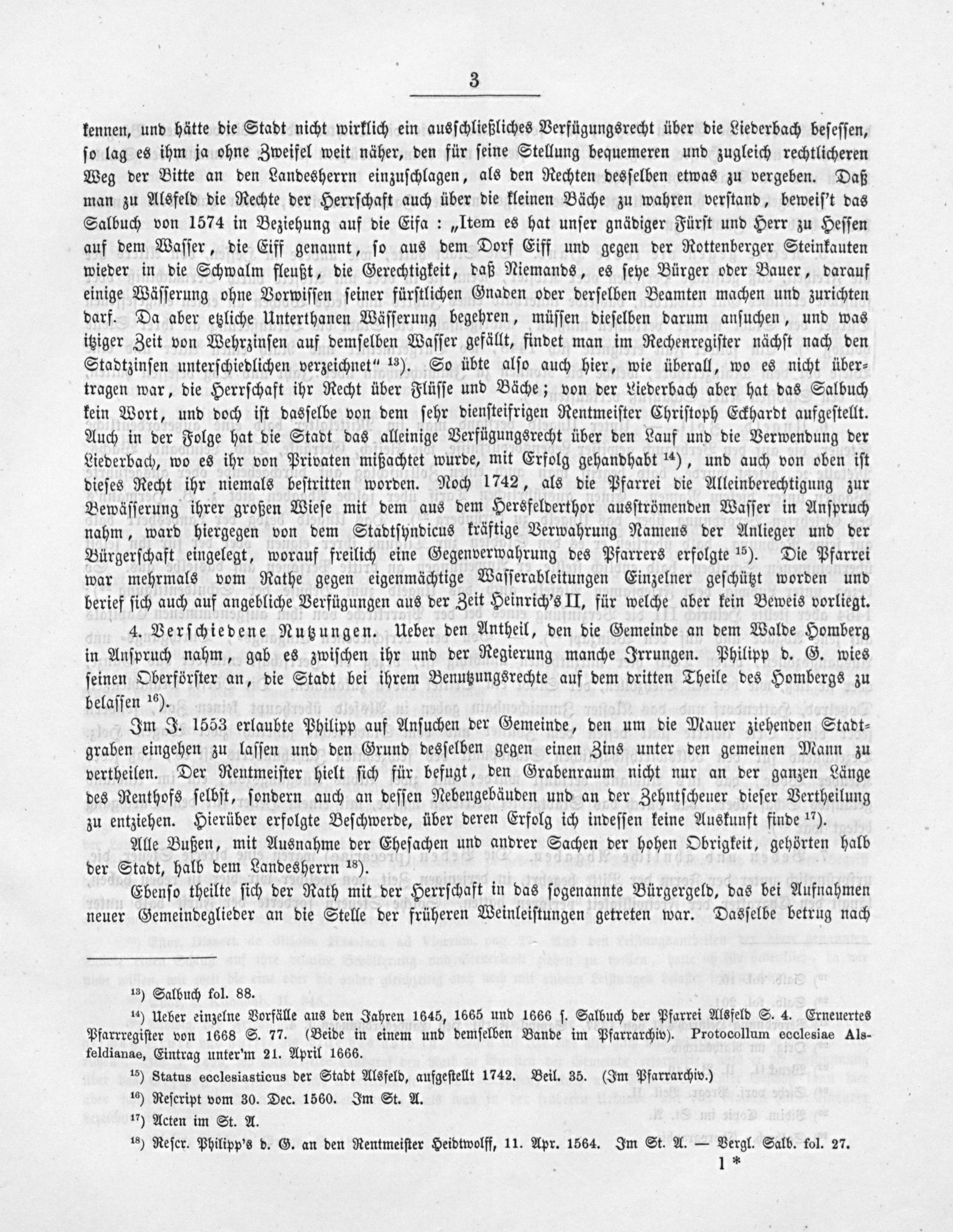 kennen, und hätte die Stadt nicht wirklich ein ausſchließliches Verfügungsrecht über die Liederbach beſeſſen, ſo lag es ihm ja ohne Zweifel weit näher, den für ſeine Stellung bequemeren und zugleich rechtlicheren Weg der Bitte an den Landesherrn einzuſchlagen, als den Rechten desſelben etwas zu vergeben. Daß man zu Alsfeld die Rechte der Herrſchaft auch über die kleinen Bäche zu wahren verſtand, beweiſ't das Salbuch von 1574 in Beziehung auf die Eifa:„Item es hat unſer gnädiger Fürſt und Herr zu Heſſen auf dem Waſſer, die Eiff genannt, ſo aus dem Dorf Eiff und gegen der Rottenberger Steinkauten wieder in die Schwalm fleußt, die Gerechtigkeit, daß Niemands, es ſeye Bürger oder Bauer, darauf einige Wäſſerung ohne Vorwiſſen ſeiner fürſtlichen Gnaden oder derſelben Beamten machen und zurichten darf. Da aber etzliche Unterthanen Wäſſerung begehren, müſſen dieſelben darum anſuchen, und was itziger Zeit von Wehrzinſen auf demſelben Waſſer gefällt, findet man im Rechenregiſter nächſt nach den Stadtzinſen unterſchiedlichen verzeichnet“ ¹³). So übte alſo auch hier, wie überall, wo es nicht über⸗ tragen war, die Herrſchaft ihr Recht über Flüſſe und Bäche; von der Liederbach aber hat das Salbuch kein Wort, und doch iſt dasſelbe von dem ſehr dienſteifrigen Rentmeiſter Chriſtoph Eckhardt aufgeſtellt. Auch in der Folge hat die Stadt das alleinige Verfügungsrecht über den Lauf und die Verwendung der Liederbach, wo es ihr von Privaten mißachtet wurde, mit Erfolg gehandhabt ¹⁴), und auch von oben iſt dieſes Recht ihr niemals beſtritten worden. Noch 1742, als die Pfarrei die Alleinberechtigung zur Bewäſſerung ihrer großen Wieſe mit dem aus dem Hersfelderthor ausſtrömenden Waſſer in Anſpruch nahm, ward hiergegen von dem Stadtſyndicus kräftige Verwahrung Namens der Anlieger und der Bürgerſchaft eingelegt, worauf freilich eine Gegenverwahrung des Pfarrers erfolgte ¹5). Die Pfarrei war mehrmals vom Rathe gegen eigenmächtige Waſſerableitungen Einzelner geſchützt worden und berief ſich auch auf angebliche Verfügungen aus der Zeit Heinrich's II, für welche aber kein Beweis vorliegt.