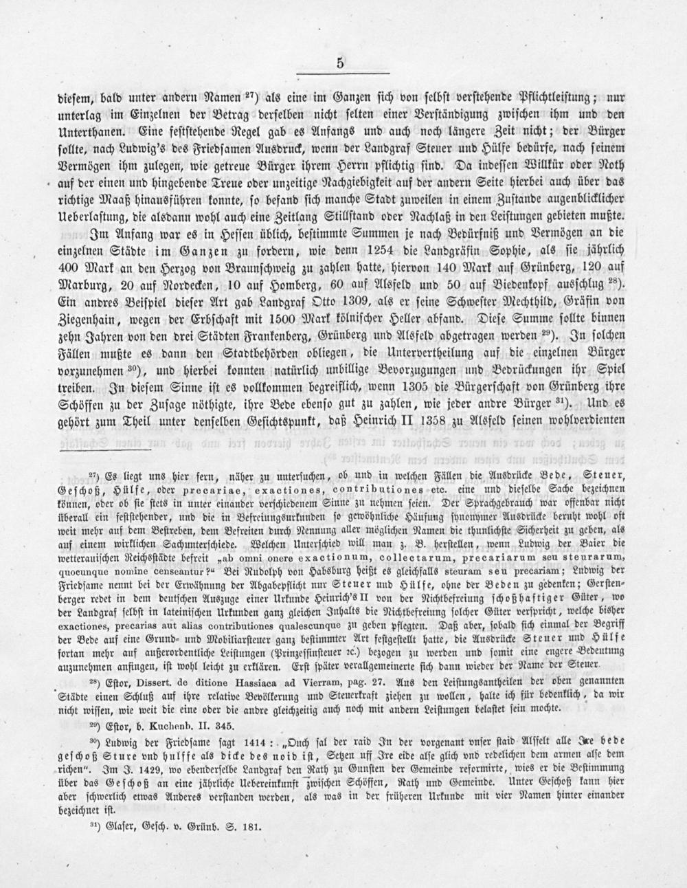 Im Anfang war es in Heſſen üblich, beſtimmte Summen je nach Bedürfniß und Vermögen an die einzelnen Städte im Ganzen zu fordern, wie denn 1254 die Landgräfin Sophie, als ſie jährlich 400 Mark an den Herzog von Braunſchweig zu zahlen hatte, hiervon 140 Mark auf Grünberg, 120 auf Marburg, 20 auf Nordecken, 10 auf Homberg, 60 auf Alsfeld und 50 auf Biedenkopf ausſchlug 29). Ein andres Beiſpiel dieſer Art gab Landgraf Otto 1309, als er ſeine Schweſter Mechthild, Gräfin von Ziegenhain, wegen der Erbſchaft mit 1500 Mark kölniſcher Heller abfand. Dieſe Summe ſollte binnen zehn Jahren von den drei Städten Frankenberg, Grünberg und Alsfeld abgetragen werden ²⁵). In ſolchen Fällen mußte es dann den Stadtbehörden obliegen, die Untervertheilung auf die einzelnen Bürger vorzunehmen ³⁰), und hierbei konnten natürlich unbillige Bevorzugungen und Bedrückungen ihr Spiel treiben. In dieſem Sinne iſt es vollkommen begreiflich, wenn 1305 die Bürgerſchaft von Grünberg ihre Schöffen zu der Zuſage nöthigte, ihre Bede ebenſo gut zu zahlen, wie jeder andre Bürger ³¹). Und es gehört zum Theil unter denſelben Geſichtspunkt, daß Heinrich II 1358 zu Alsfeld ſeinen wohlverdienten