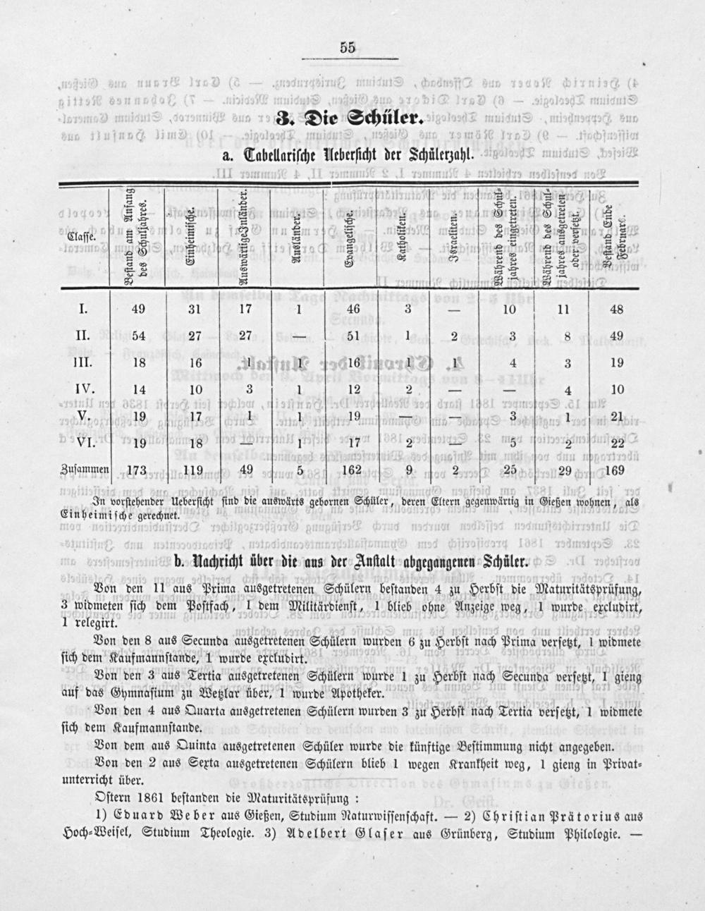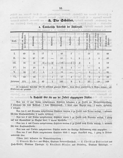 Oſtern 1861 beſtanden die Maturitätsprüfung: 1) Eduard Weber aus Gießen, Studium Naturwiſſenſchaft.— 2) Chriſtian Prätorius aus Hoch⸗Weiſel, Studium Theologie. 3) Adelbert Glaſer aus Grünberg, Studium Philologie.—