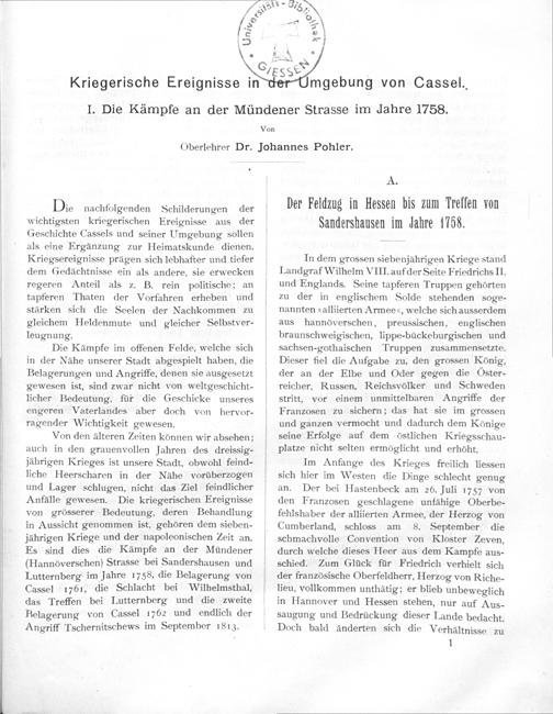 Von den älteren Zeiten können wir absehen; auch in den grauenvollen Jahren des dreissig- jährigen Krieges ist unsere Stadt, obwohl feind- liche Heerscharen in der Nähe vorüberzogen und Lager schlugen, nicht das Ziel feindlicher Anfälle gewesen. Die kriegerischen Ereignisse von grösserer Bedeutung, deren Behandlung in Aussicht genommen ist, gehören dem sieben- jährigen Kriege und der napoleonischen Zeit an. Es sind dies die Kämpfe an der Mündener (Hannòverschen) Strasse bei Sandershausen und Lutternberg im Jahre 1758, die Belagerung von Cassel 1761, die Schlacht bei Wilhelmsthal, das Treffen bei Lutternberg und die zweite Belagerung von Cassel 1762 und endlich der Angriff Tschernitschews im September 1813.