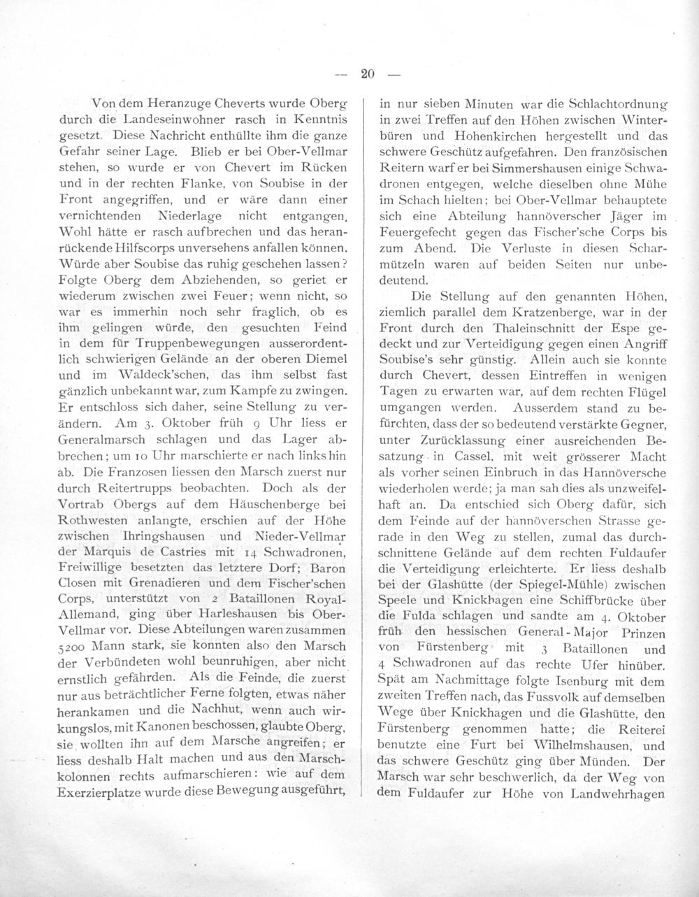 Von dem Heranzuge Cheverts wurde Oberg durch die Landeseinwohner rasch in Kenntnis gesetzt. Diese Nachricht enthüllte ihm die ganze Gefahr seiner Lage. Blieb er bei Ober-Vellmar stehen, so wurde er von Chevert im Rücken und in der rechten Flanke, von Soubise in der Front angegriffen, und er wäre dann einer vernichtenden Niederlage nicht entgangen. Wohl hätte er rasch aufbrechen und das heran- rückende Hilfscorps unversehens anfallen können. Würde aber Soubise das ruhig geschehen lassen? Folgte Oberg dem Abaziehenden, so geriet er wiederum zwischen zwei Feuer; wenn nicht, so war es immerhin noch sehr fraglich, ob es ihm gelingen würde, den gesuchten Feind in dem für Truppenbewegungen ausserordent- lich schwierigen Gelände an der oberen Diemel und im Waldeck'schen, das ihm selbst fast gänzlich unbekannt war, zum Kampfe zu zwingen. Er entschloss sich daher, seine Stellung zu ver- ändern. Am 3. Oktober früh ο Uhr liess er Generalmarsch schlagen und das Lager ab-— brechen; um 10 Uhr marschierte er nach links hin ab. Die Franzosen liessen den Marsch zuerst nur durch Reitertrupps beobachten. Doch als der Vortrab Obergs auf dem Häuschenberge bei Rothwesten anlangte, erschien auf der Höhe zwischen Ihringshausen und Nieder-Vellmar der Marquis de Castries mit 14 Schwadronen, Freiwillige besetzten das letztere Dorf; Baron Closen mit Grenadieren und dem Fischer'schen Corps, unterstützt von 2 Bataillonen Royal- Allemand, ging über Harleshausen bis Ober- Vellmar vor. Diese Abteilungen waren zusammen 5200 Mann stark, sie konnten also den Marsch