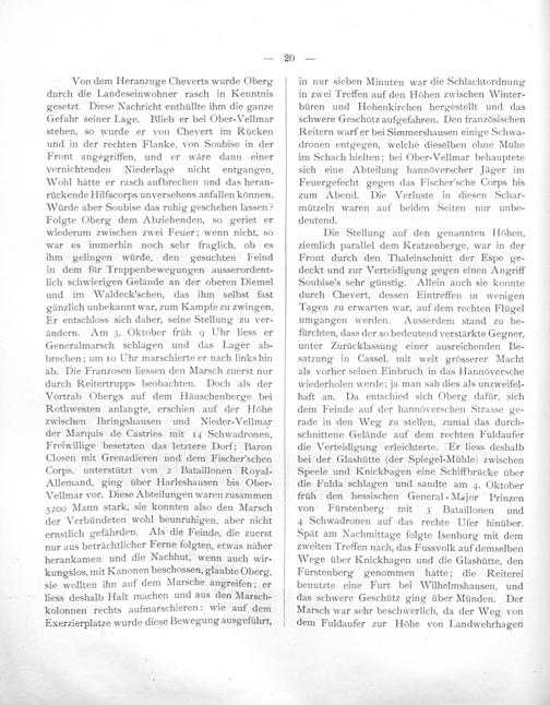 Die Stellung auf den genannten Höhen, ziemlich parallel dem Kratzenberge, war in der Front durch den Thaleinschnitt der Espe ge- deckt und zur Verteidigung gegen einen Angriff Soubise's sehr günstig. Allein auch sie konnte durch Chevert, dessen Eintreffen in wenigen Tagen zu erwarten war, auf dem rechten Flügel umgangen werden. Ausserdem stand zu be- fürchten, dass der so bedeutend verstärkte Gegner, unter Zurücklassung einer ausreichenden Be- satzung in Cassel. mit weit grösserer Macht als vorher seinen Einbruch in das Hannòversche wiederholen werde; ja man sah dies als unzweifel- haft an. Da entschied sich Oberg dafür, sich dem Feinde auf der hannôverschen Strasse ge- rade in den Weg zu stellen, zumal das durch- schnittene Gelände auf dem rechten Fuldaufer die Verteidigung erleichterte. Er liess deshalb bei der Glashütte(der Spiegel-Mühle) zwischen Speele und Knickhagen eine Schiffbrücke über die Fulda schlagen und sandte am 4. Oktober frün den hessischen General-Major Prinzen von Fürstenberg mit 3 Bataillonen und 4 Schwadronen auf das rechte Ufer hinüber. Spät am Nachmittage folgte Isenburg mit dem zweiten Treffen nach, das Fussvolk auf demselben Wege über Knickhagen und die Glashütte, den Fürstenberg genommen hatte; die Reiterei benutzte eine Furt bei Wilhelmshausen, und das schwere Geschütz ging über Münden. Der Marsch war sehr beschwerlich, da der Weg von dem Fuldaufer zur Hôohe von Landwehrhagen