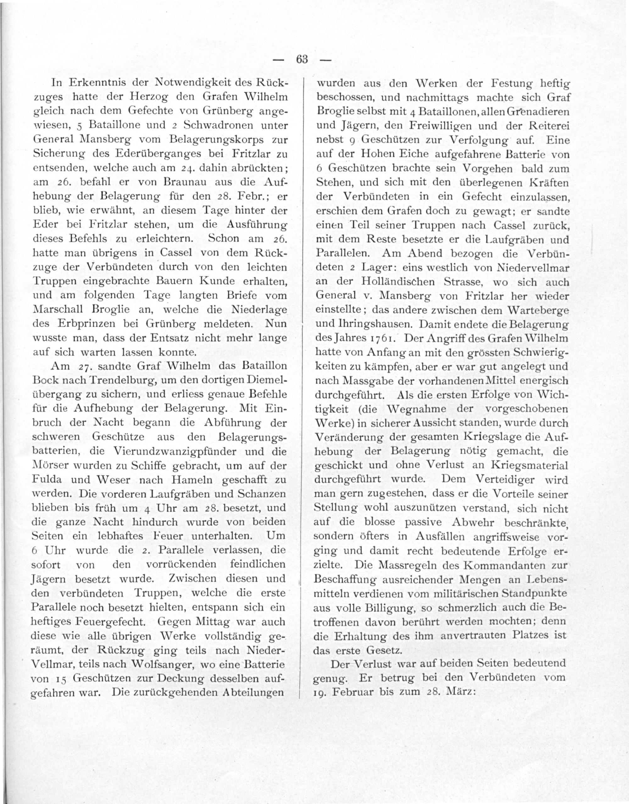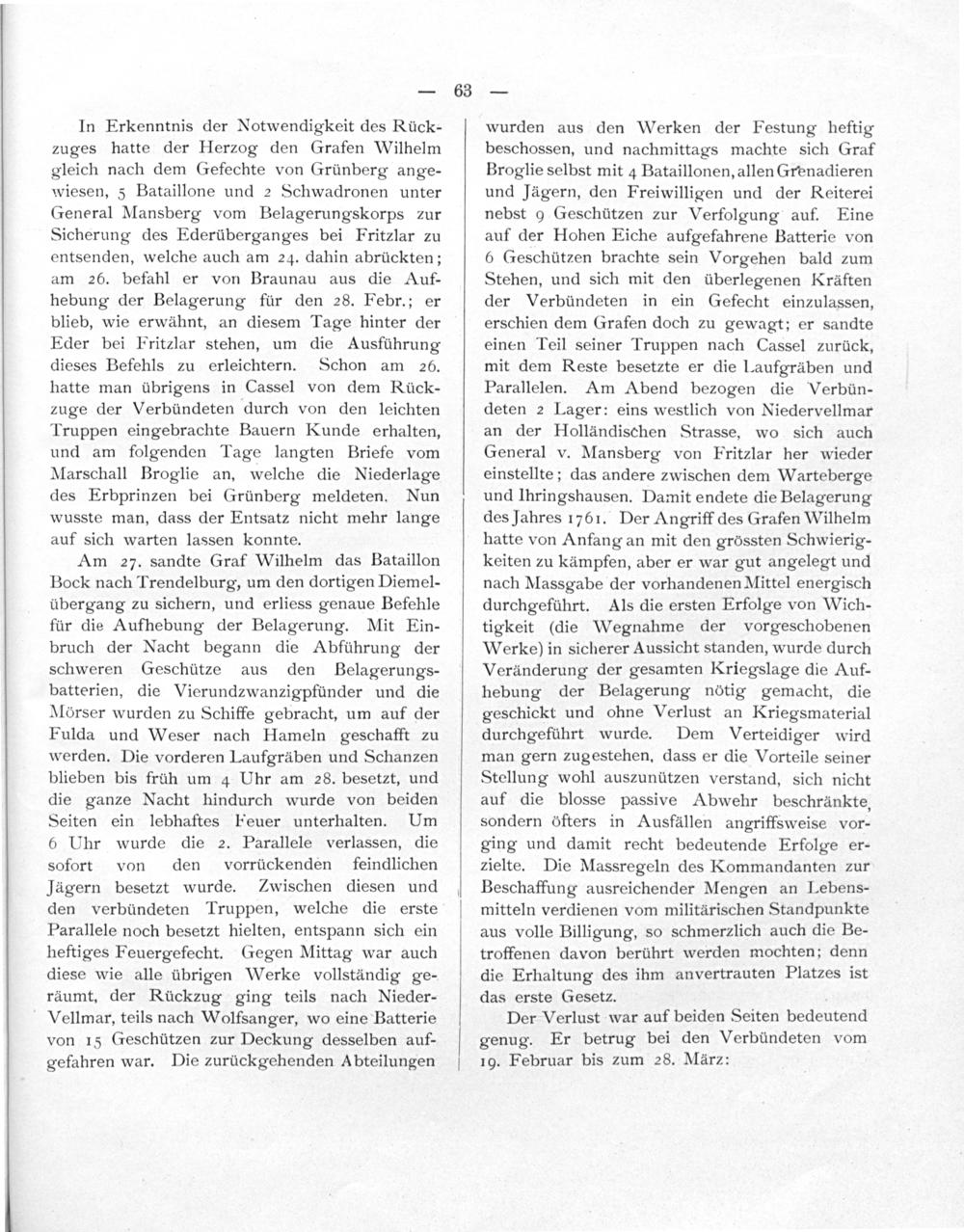 In Erkenntnis der Notwendigkeit des Rück- zuges hatte der Herzog den Grafen Wilhelm gleich nach dem Gefechte von Grünberg ange- wiesen, 5 Bataillone und 2 Schwadronen unter General Mansberg vom Belagerungskorps zur Sicherung des Ederüberganges bei Fritzlar zu entsenden, welche auch am 24. dahin abrückten; am 26. befahl er von Braunau aus die Auf- hebung der Belagerung für den 28. Febr.; er blieb, wie erwähnt, an diesem Tage hinter der Eder bei Fritzlar stehen, um die Ausführung dieses Befehls zu erleichtern. Schon am 256. hatte man übrigens in Cassel von dem Rück- zuge der Verbündeten durch von den leichten Truppen eingebrachte Bauern Kunde erhalten, und am folgenden Tage langten Briefe vom Marschall Broglie an, welche die Niederlage des Erbprinzen bei Grünberg meldeten. Nun wusste man, dass der Entsatz nicht mehr lange auf sich warten lassen konnte.