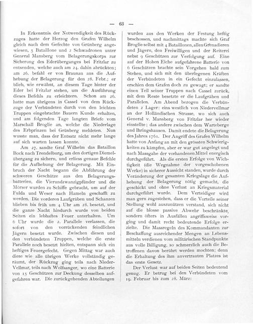 wurden aus den Werken der Festung heftig beschossen, und nachmittags machte sich Graf Broglie selbst mit 4 Bataillonen, allen Grenadieren und Jägern, den Freiwilligen und der Reiterei nebst 9 Geschützen zur Verfolgung auf. Eine auf der Hohen Eiche aufgefahrene Batterie von 6 Geschützen brachte sein Vorgehen bald zum Stehen, und sich mit den überlegenen Kräften der Verbündeten in ein Gefecht einzulassen, erschien dem Grafen doch zu gewagt; er sandte einen Teil seiner Truppen nach Cassel zurück, mit dem Reste besetzte er die Laufgräben und Parallelen. Am Abend bezogen die Verbün- deten 2 Lager: eins westlich von Niedervellmar an der Holländischen Strasse, wo sich auch General v. Mansberg von Fritzlar her wieder einstellte; das andere zwischen dem Warteberge und Ihringshausen. Damit endete die Belagerung des Jahres 1761. Der Angriff des Grafen Wilhelm hatte von Anfang an mit den grossten Schwierig- keiten zu kämpfen, aber er war gut angelegt und nach Massgabe der vorhandenen Mittel energisch durchgeführt. Als die ersten Erfolge von Wich- tigkeit(die Wegnahme der vorgeschobenen Werke) in sicherer Aussicht standen, wurde durch Veränderung der gesamten Kriegslage die Auf- hebung der Belagerung nôtig gemacht, die geschickt und ohne Verlust an Kriegsmaterial durchgeführt wurde. Dem Verteidiger wird man gern zugestehen, dass er die Vorteile seiner Stellung wohl auszunützen verstand, sich nicht auf die blosse passive Abwehr beschränkte, sondern öfters in Ausfällen angriffsweise vor- ging und damit recht bedeutende Erfolge er- zielte. Die Massregeln des Kommandanten zur Beschaffung ausreichender Mengen an Lebens- mitteln verdienen vom militärischen Standpunkte aus volle Billigung, so schmerzlich auch die Be- troffenen davon berührt werden mochten; denn die Erhaltung des ihm anvertrauten Platzes ist das erste Gesetz.