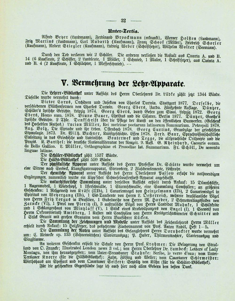 Viector Carus, Orchideen und Inſekten von Charles Darwin. Stuttgart 1877. Derſelbe, die verſchiedenen Blüthenformen von Charles Darwin. Georg Ebers, Uarda. Fünfzehnte Auflage. Düntzer, Schillers lyriſche Gedichte. Leipzig 1874. Georg Ebers, durch Goſen zum Sinai. Leipzig 1872. Georg Ebers, Homo sum. 1878. Bruno Bauer, Chriſtus und die Cäſaren. Berlin 1877. Düntzer, Goethe s lyriſche Gedichte. 2 Thle. Denkſchrift über die Pflege der Kunſt an den öffentlichen Bauwerken.(Geſchenk des Hochedlen Rathes.) Lucian Müller, Rei metricae Poetarum latinorum Summuarium. Petropoli 1878. Aug. Boltz, Die Sprache und ihr Leben Oſſenbach 1878. Georg Curtius, Grundzüge der rihiſchen Etymologie. 1873. Dr. Wilh. Buchner, Kunſtgeſchichte. Eſſen 1878. Ferd. Baur, Sprachwiſſen Ginleitung in das Griechiſce und Lattiniſche, Bouterwel und Tegge, die allſprachliche Orthorpie Praris, K. Barthel: die deutſche Nationalliteratur der Neuzeit, 9. Auftl. G. Rheinhard, Catsaris 1 de Bello Gallico. L. Müller, Orthographiae et Prosodine lat. Summarium. Fr. Schöll, De accentu lingune latinae.