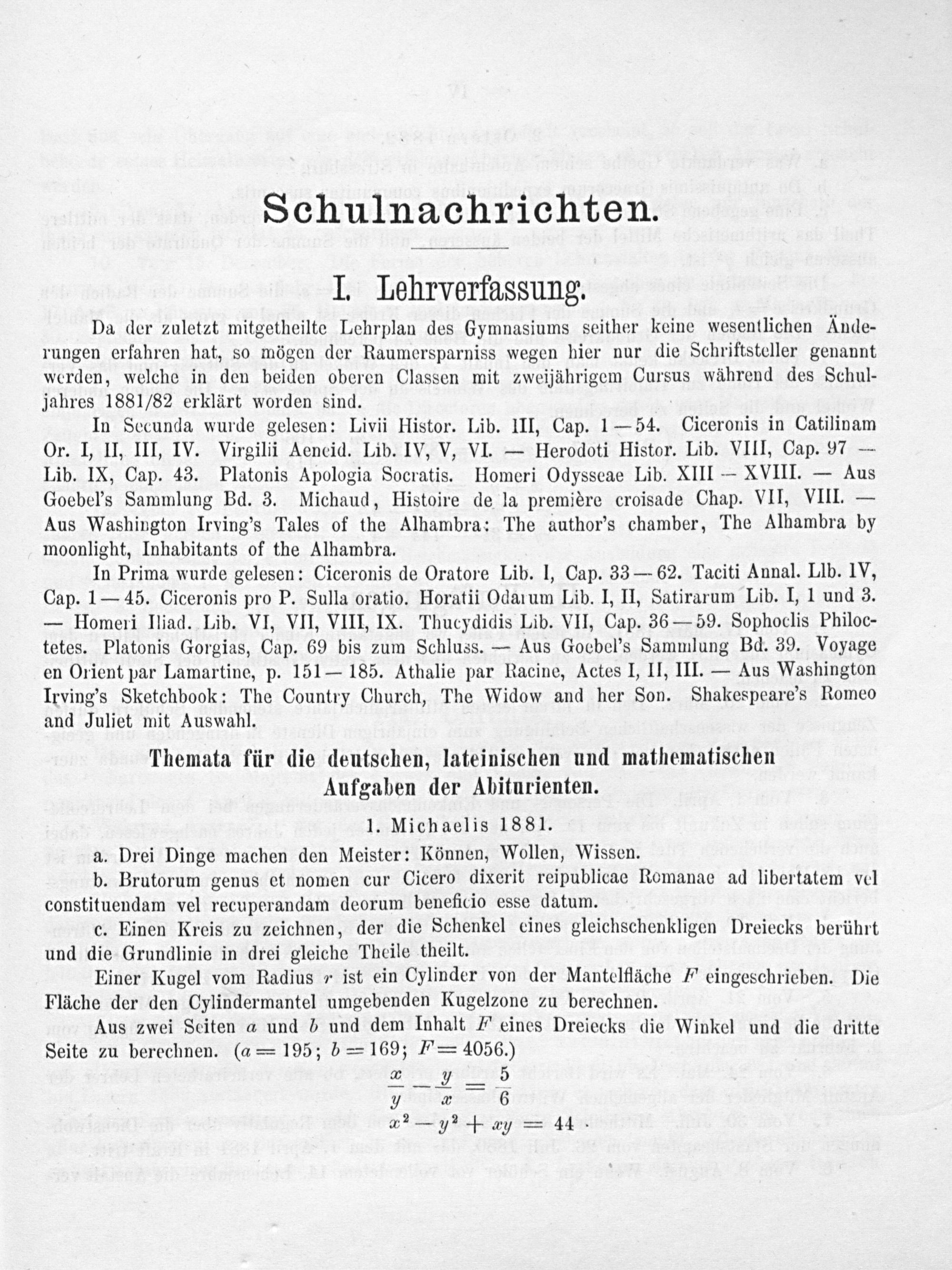 Da der zuletzt mitgetheilte Lehrplan des Gymnasiums seither keine wesentlichen Ande- rungen erfahren hat, so mögen der Raumersparniss wegen hier nur die Schriftsteller genannt werden, welche in den beiden oberen Classen mit zweijährigem Cursus während des Schul- jahres 1881/82 erklärt worden sind.