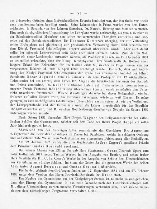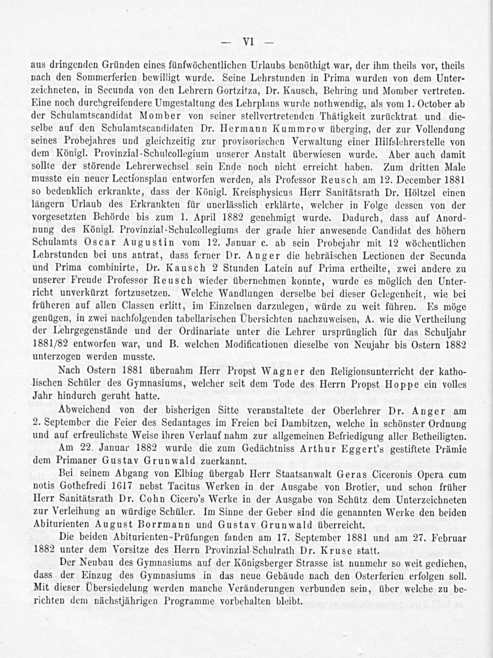 aus dringenden Gründen eines fünfwöchentlichen Urlaubs benöthigt war, der ihm theils vor, theils nach den Sommerferien bewilligt wurde. Seine Lehrstunden in Prima wurden von dem Unter- zeichneten, in Secunda von den Lehrern Gortzitza, Dr. Kausch, Behring und Momber vertreten. Eine noch durchgreifendere Umgestaltung des Lehrplans wurde nothwendig, als vom 1. October ab der Schulamtscandidat Momber von seiner stellvertretenden Thätigkeit zurücktrat und die- selbe auf den Schulamtscandidaten Dr. Hermann Kummrow überging, der zur Vollendung seines Probejahres und gleichzeitig zur provisorischen Verwaltung einer Hilfslehrerstelle von dem Königl. Provinzial-Schulcollegium unserer Anstalt überwiesen wurde. Aber auch damit sollte der störende Lehrerwechsel sein Ende noch nicht erreicht haben. Zum dritten Male musste ein neuer Lectionsplan entworfen werden, als Professor Reusch am 12. December 1881 so bedenklich erkrankte, dass der Königl. Kreisphysicus Herr Sanitätsrath Dr. Höltzel einen längern Urlaub des Erkrankten für unerlässlich erklärte, welcher in Folge dessen von der vorgesetzten Behörde bis zum 1. April 1882 genehmigt wurde. Dadurch, dass auf Anord- nung des Königl. Provinzial-Schulcollegiums der grade hier anwesende Candidat des höhern Schulamts Oscar Augustin vom 12. Januar c. ab sein Probejahr mit 12 wöchentlichen Lehrstunden bei uns antrat, dass ferner Dr. Anger die hebräischen Lectionen der Secunda und Prima combinirte, Dr. Kausch 2 Stunden Latein auf Prima ertheilte, zwei andere zu unserer Freude Professor Reusch wieder übernehmen konnte, wurde es möglich den Unter- richt unverkürzt fortzusetzen. Welche Wandlungen derselbe bei dieser Gelegenheit, wie bei früheren auf allen Classen erlitt, im Einzelnen darzulegen, würde zu weit führen. Es möge genügen, in zwei nachfolgenden tabellarischen Ubersichten nachzuweisen, A. wie die Vertheilung der Lehrgegenstände und der Ordinariate unter die Lehrer ursprünglich für das Schuljahr 1881/82 entworfen war, und B. welchen Modificationen dieselbe von Neujahr bis Ostern 1882 unterzogen werden musste.