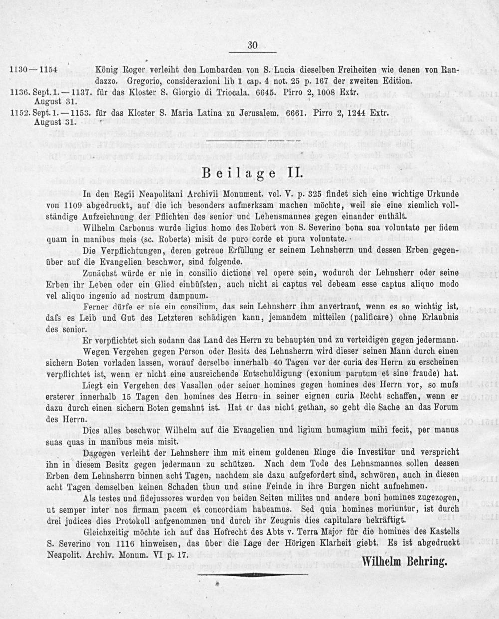 In den Regii Neapolitani Archivii Monument. vol. V. p. 325 findet sich eine wichtige Urkunde von 1109 abgedruckt, auf die ich besonders aufmerksam machen möchte, weil sie eine ziemlich voll- ständige Aufzeichnung der Pflichten des senior und Lehensmannes gegen einander enthält.