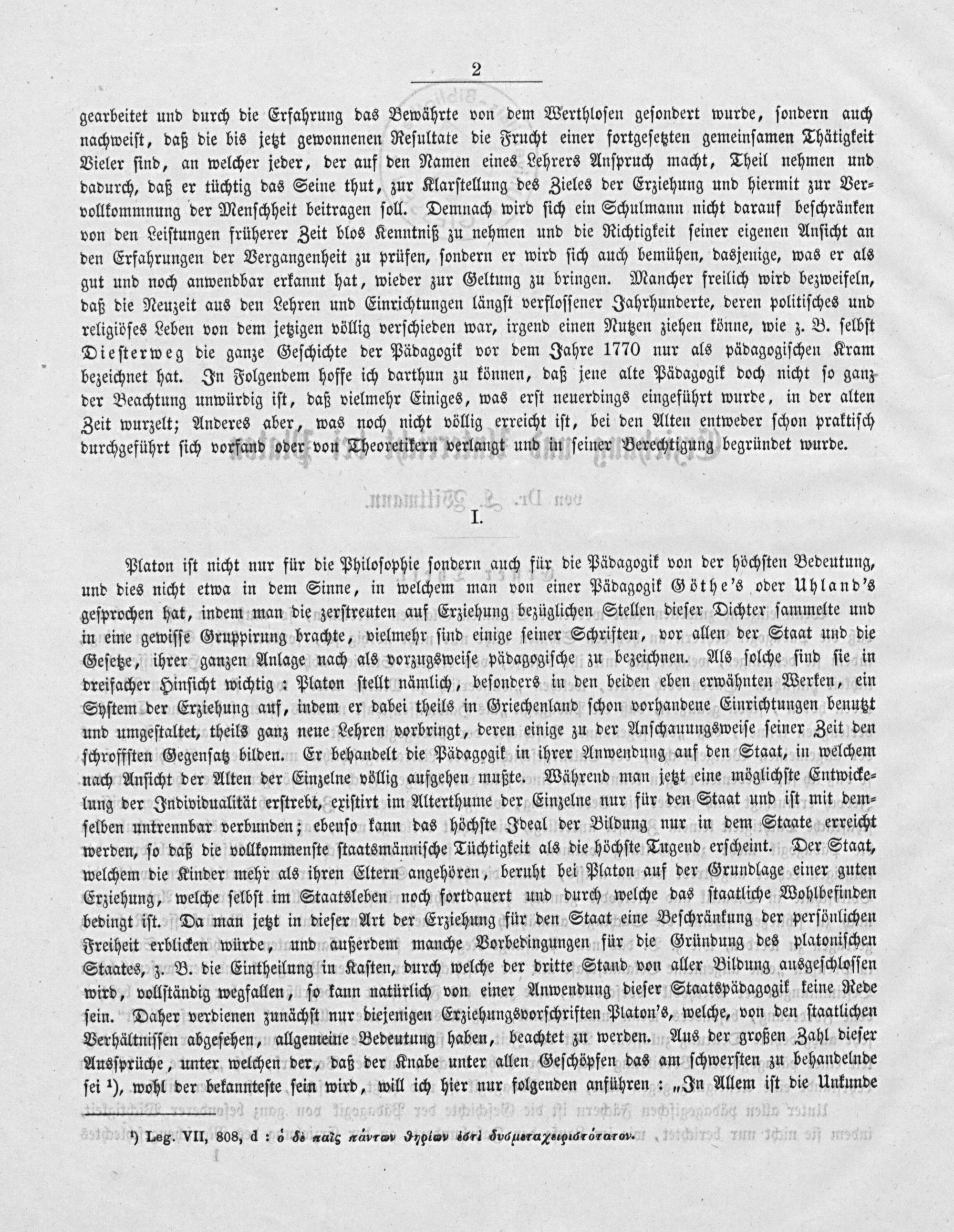 Platon iſt nicht nur für die Philoſophie ſondern auch für die Pädagogik von der höchſten Bedeutung, und dies nicht etwa in dem Sinne, in welchem man von einer Pädagogik Göthe's oder Uhland's geſprochen hat, indem man die zerſtreuten auf Erziehung bezüglichen Stellen dieſer Dichter ſammelte und in eine gewiſſe Gruppirung brachte, vielmehr ſind einige ſeiner Schriften, vor allen der Staat und die Geſetze, ihrer ganzen Anlage nach als vorzugsweiſe pädagogiſche zu bezeichnen. Als ſolche ſind ſie in dreifacher Hinſicht wichtig: Platon ſtellt nämlich, beſonders in den beiden eben erwähnten Werken, ein Syſtem der Erziehung auf, indem er dabei theils in Griechenland ſchon vorhandene Einrichtungen benutzt und umgeſtaltet, theils ganz neue Lehren vorbringt, deren einige zu der Anſchauungsweiſe ſeiner Zeit den ſchroffſten Gegenſatz bilden. Er behandelt die Pädagogik in ihrer Anwendung auf den Staat, in welchem nach Anſicht der Alten der Einzelne völlig aufgehen mußte. Während man jetzt eine möglichſte Entwicke⸗ lung der Individualität erſtrebt, exiſtirt im Alterthume der Einzelne nur für den Staat und iſt mit dem⸗ ſelben untrennbar verbunden; ebenſo kann das höchſte Ideal der Bildung nur in dem Staate erreicht werden, ſo daß die vollkommenſte ſtaatsmänniſche Tüchtigkeit als die höchſte Tugend erſcheint. Der Staat, welchem die Kinder mehr als ihren Eltern angehören, beruht bei Platon auf der Grundlage einer guten Erziehung, welche ſelbſt im Staatsleben noch fortdauert und durch welche das ſtaatliche Wohlbefinden bedingt iſt. Da man jetzt in dieſer Art der Erziehung für den Staat eine Beſchränkung der perſönlichen Freiheit erblicken würde, und außerdem manche Vorbedingungen für die Gründung des platoniſchen Staates, z. B. die Eintheilung in Kaſten, durch welche der dritte Stand von aller Bildung ausgeſchloſſen wird, vollſtändig wegfallen, ſo kann natürlich von einer Anwendung dieſer Staatspädagogik keine Rede ſein. Daher verdienen zunächſt nur diejenigen Erziehungsvorſchriften Platon's, welche, von den ſtaatlichen Verhältniſſen abgeſehen, allgemeine Bedeutung haben, beachtet zu werden. Aus der großen Zahl dieſer Ausſprüche, unter welchen der, daß der Knabe unter allen Geſchöpfen das am ſchwerſten zu behandelnde ſei ¹), wohl der bekannteſte ſein wird, will ich hier nur folgenden anführen:„In Allem iſt die Unkunde