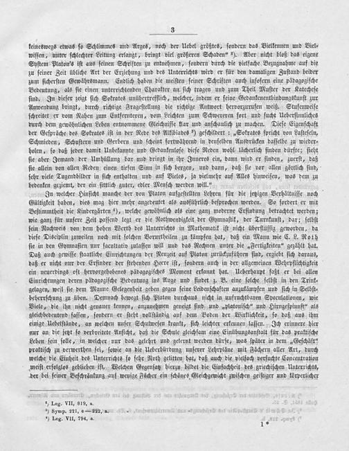 In welcher Hinſicht manche der von Platon aufgeſtellten Lehren für die jetzigen Verhältniſſe noch Gültigkeit haben, dies mag hier mehr angedeutet als ausführlich beſprochen werden. So fordert er mit Beſtimmtheit die Kindergärten ⁴), welche gewöhnlich als eine ganz moderne Erfindung betrachtet werden; wie ganz für unſere Zeit paſſend legt er die Nothwendigkeit der Gymnaſtik, der Turnkunſt, dar; ſelbſt ſein Nachweis von dem hohen Werth des Unterrichts in Mathematik iſt nicht überflüſſig geworden, da dieſe Disciplin zuweilen noch mit ſolchen Vorurtheilen zu kämpfen hat, daß ein Mann wie C. L. Roth ſie in den Gymnaſien nur facultativ zulaſſen will und das Rechnen unter die„Fertigkeiten“ gezählt hat. Daß auch gewiſſe ſtaatliche Einrichtungen der Neuzeit auf Platon zurückzuführen ſind, ergiebt ſich daraus, daß er nicht nur der Erfinder der ſtehenden Heere iſt, ſondern auch in der allgemeinen Wehrpflichtigkeit ein neuerdings oft hervorgehobenes pädagogiſches Moment erkannt hat. Ueberhaupt faßt er bei allen Einrichtungen deren pädagogiſche Bedeutung ins Auge und findet z. B. eine ſolche ſelbſt in den Trink⸗ gelagen, weil ſie dem Manne Gelegenheit geben gegen ſeine Leidenſchaften anzukämpfen und ſich in Selbſt⸗ beherrſchung zu üben. Demnach bewegt ſich Platon durchaus nicht in unfruchtbaren Speculationen, wie Viele, die ihn nicht genauer kennen, anzunehmen geneigt ſind und„platoniſch“ und Hirngeſpinnſt“ als gleichbedeutend faſſen, ſondern er ſteht vollſtändig auf dem Boden der Wirklichkeit, ſo daß aus ihm einige Uebelſtände, an welchen unſer Schulweſen krankt, ſich leichter erkennen laſſen. Ich erinnere hier nur an die jetzt ſo verbreitete Anſicht, daß die Schule gleichſam eine Einübungsanſtalt für das praktiſche Leben ſein ſolle, in welcher nur das gelehrt und gelernt werden dürfe, was ſpäter in dem„Geſchäft“ praktiſch zu verwerthen ſei, ſowie an die Ueberbürdung unſerer Lehrpläne mit Fächern aller Art, durch welche die Einheit des Unterrichts ſo ſehr Noth gelitten hat, daß auch die vielfach verſuchte Concentration mmeiſt erfolglos geblieben iſt. Welchen Gegenſatz hierzu bildet die Einfachheit des griechiſchen Unterrichts, der bei ſeiner Beſchränkung auf wenige Fächer ein ſchönes Gleichgewicht zwiſchen geiſtiger und körperlicher