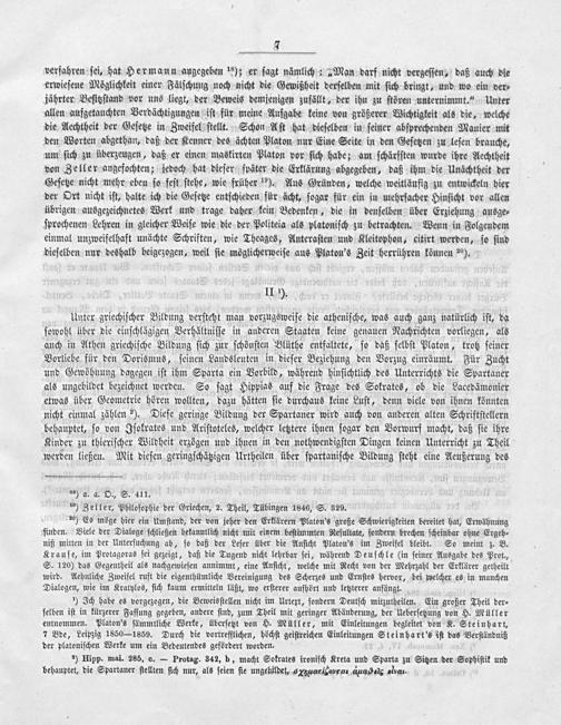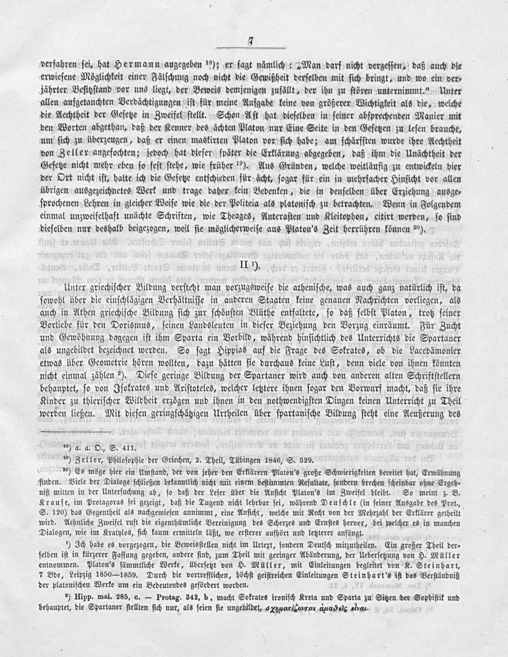 verfahren ſei, hat Hermann augegeben ¹s); er ſagt nämlich:„Man darf nicht vergeſſen, daß auch die erwieſene Möglichkeit einer Fälſchung noch nicht die Gewißheit derſelben mit ſich bringt, und wo ein ver⸗ jährter Beſitzſtand vor uns liegt, der Beweis demjenigen zufällt, der ihn zu ſtören unternimmt.“ Unter allen aufgetauchten Verdächtigungen iſt für meine Aufgabe keine von größerer Wichtigkeit als die, welche die Aechtheit der Geſetze in Zweifel ſtellt. Schon Aſt hat dieſelben in ſeiner abſprechenden Manier mit den Worten abgethan, daß der Kenner des ächten Platon nur Eine Seite in den Geſetzen zu leſen brauche, um ſich zu überzeugen, daß er einen maskirten Platon vor ſich habe; am ſchärfſten wurde ihre Aechtheit von Zeller angefochten; jedoch hat dieſer ſpäter die Erklärung abgegeben, daß ihm die Unächtheit der Geſetze nicht mehr eben ſo feſt ſtehe, wie früher ¹2). Aus Gründen, welche weitläufig zu entwickeln hier der Ort nicht iſt, halte ich die Geſetze entſchieden für ächt, ſogar für ein in mehrfacher Hinſicht vor allen übrigen ausgezeichnetes Werk und trage daher kein Bedenken, die in denſelben über Erziehung ausge⸗ ſprochenen Lehren in gleicher Weiſe wie die der Politeia als platoniſch zu betrachten. Wenn in Folgendem einmal unzweifelhaft unächte Schriften, wie Theages, Anteraſten und Kleitophon, citirt werden, ſo ſind dieſelben nur deshalb beigezogen, weil ſie möglicherweiſe aus Platon's Zeit herrühren können ²⁰¹).